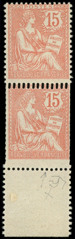 Retouché, 15c. vermillon, PAIRE verticale bdf, un ex. DOUBLE piquage, TB (Image)