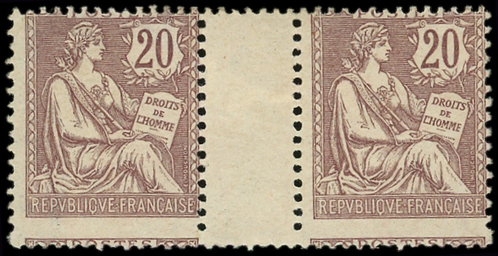 Retouché, 20c. brun lilas, PIQUAGE légèrement A CHEVAL, PAIRE interpanneau, TB (Image)