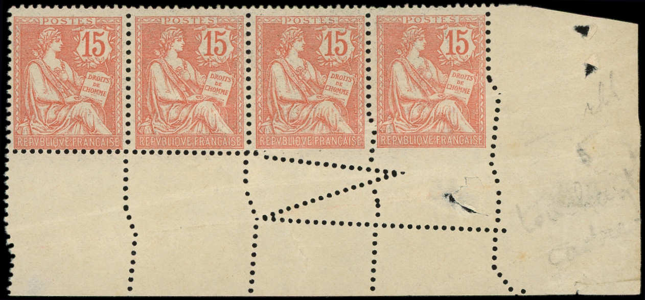 Retouché, 15c. vermillon, 5 TOUCHANT le cadre dans une BANDE de 4 cdf avec PIQUAGE OBLIQUE, TTB (Image)