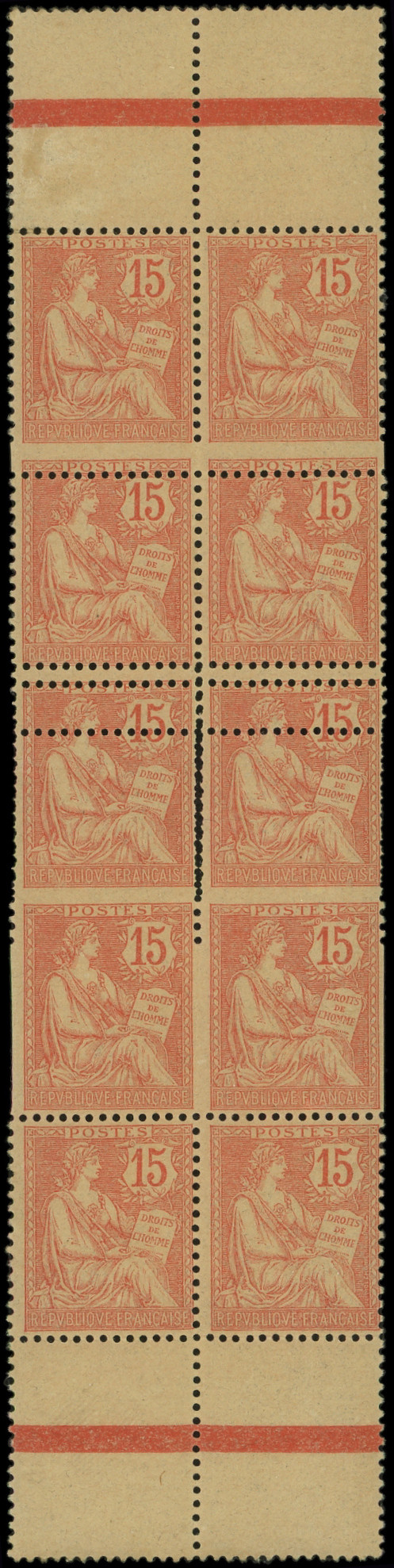 Retouché, 15c. vermillon, BLOC de 10 avec bords, spectaculaire VARIETE avec PIQUAGE DOUBLE tenant à NON DENTELE 3 côtés, TTB (Image)