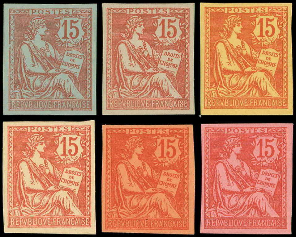 Retouché, 15c. vermillon, 6 Essais NON DENTELES sur papier de couleur, tous différents, TB (Image)