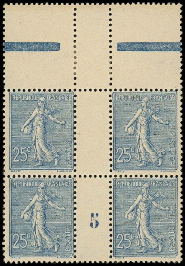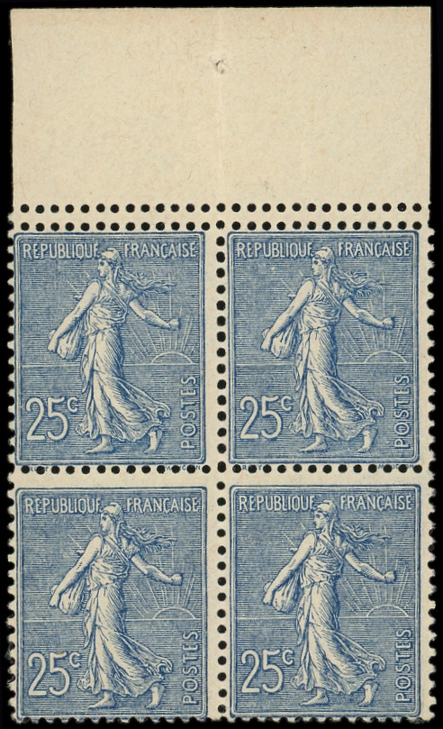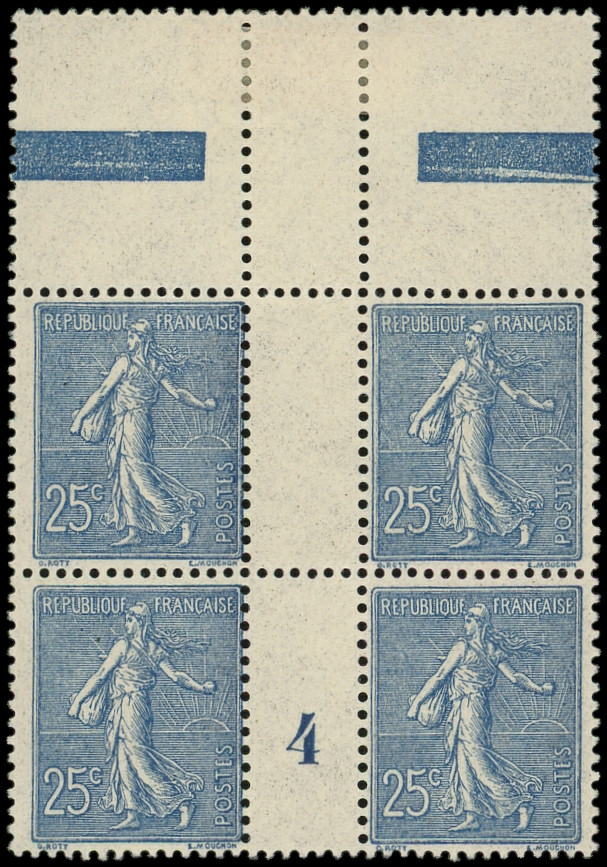 Lignée, 25c. bleu, BLOC de 4 bdf, PAIRE supérieure DOUBLE PIQUAGE horizontal, TB, cote Maury (Image)