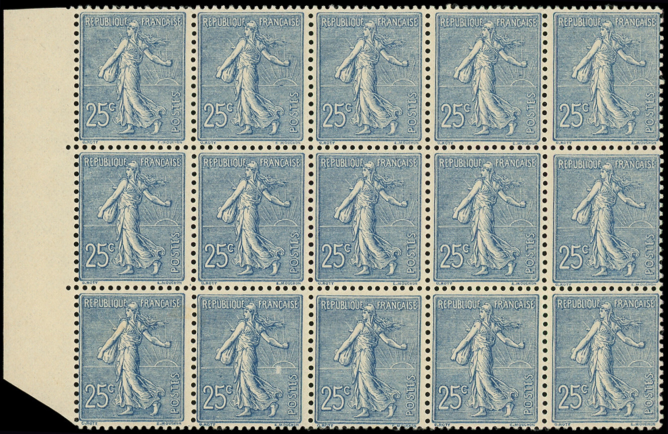 Lignée, 25c. bleu, BLOC de 15 bdf, légères adh. rouges, sinon TB (Image)