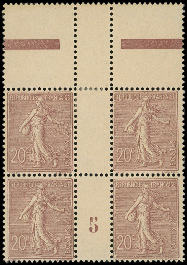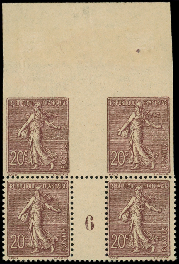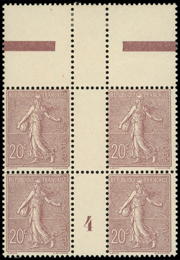 Lignée, 20c. brun-lilas foncé, BLOC de 4 Mill.6 haut de feuille NON DENTELE tenant à dentelé, PAIRE Mill. 6 **, R et TTB (Image)