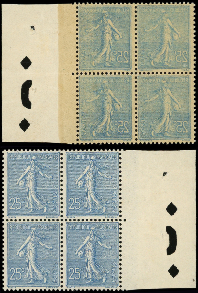 Lignée, 25c. bleu, RECTO-VERSO dans un BLOC de 4 bdf, TB (Image)
