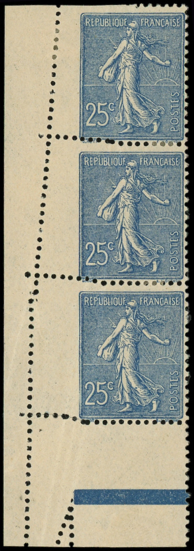 Lignée, 25c. bleu, BANDE de 3 cdf avec Variété de PIQUAGE, TB (Image)