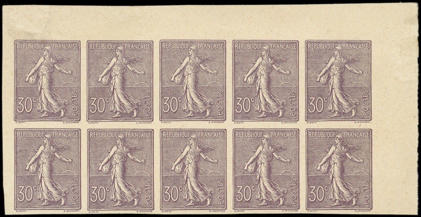 Lignée, 30c. lilas, Epreuve du galvano, BLOC de 10 NON DENTELE cdf, 1 ex. pli, les autres TB (Image)