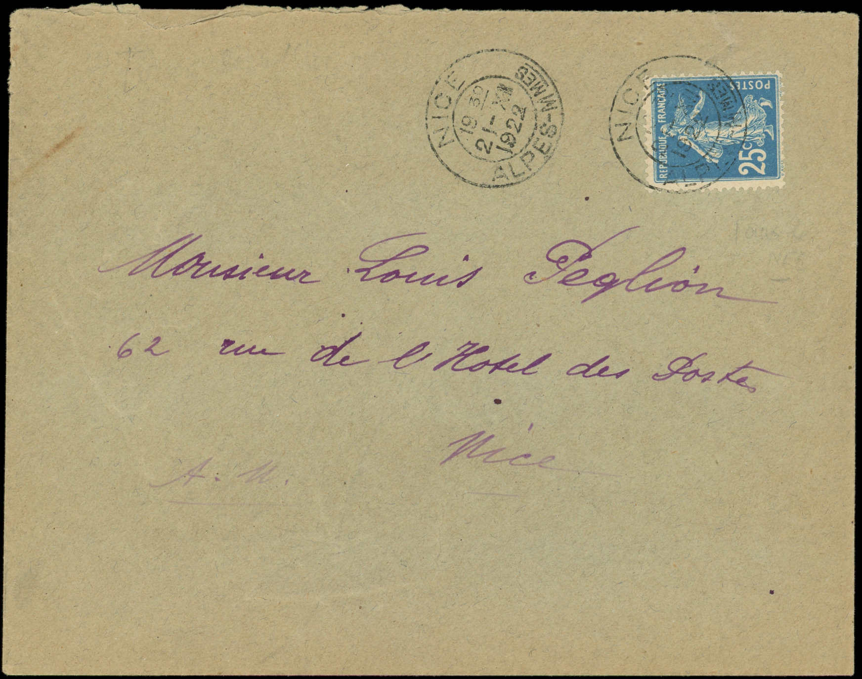 Camée, 25c. bleu, FAUX de Nice obl. NICE 31/11/22 s. Env., TB, cote Maury (Image)