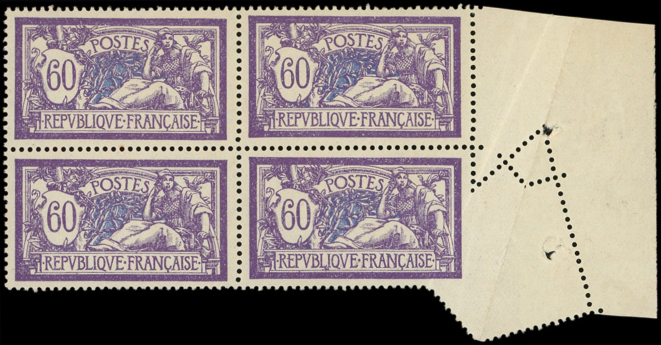 60c. violet et bleu, BLOC de 4 bdf avec jolie variété de PIQUAGE, TB (Image)