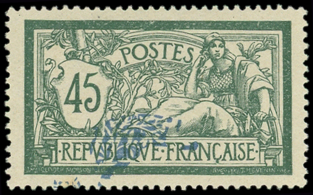 45c. vert et bleu, centre TRES DEPLACE, bien centré, TB (Image)