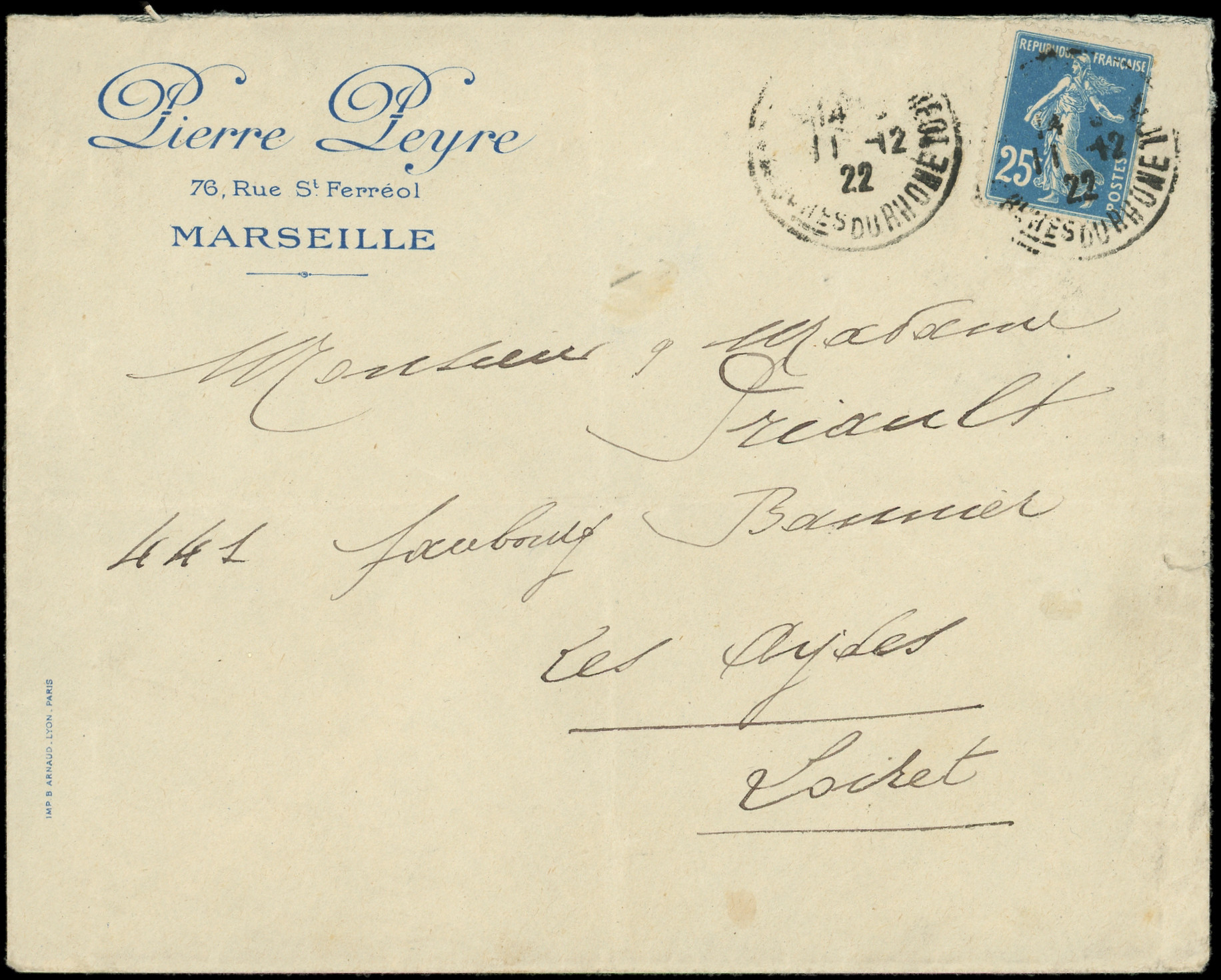 Camée, 25c. bleu, FAUX de Nice obl. 11/12/22 s. Env. de Marseille, TB (Image)