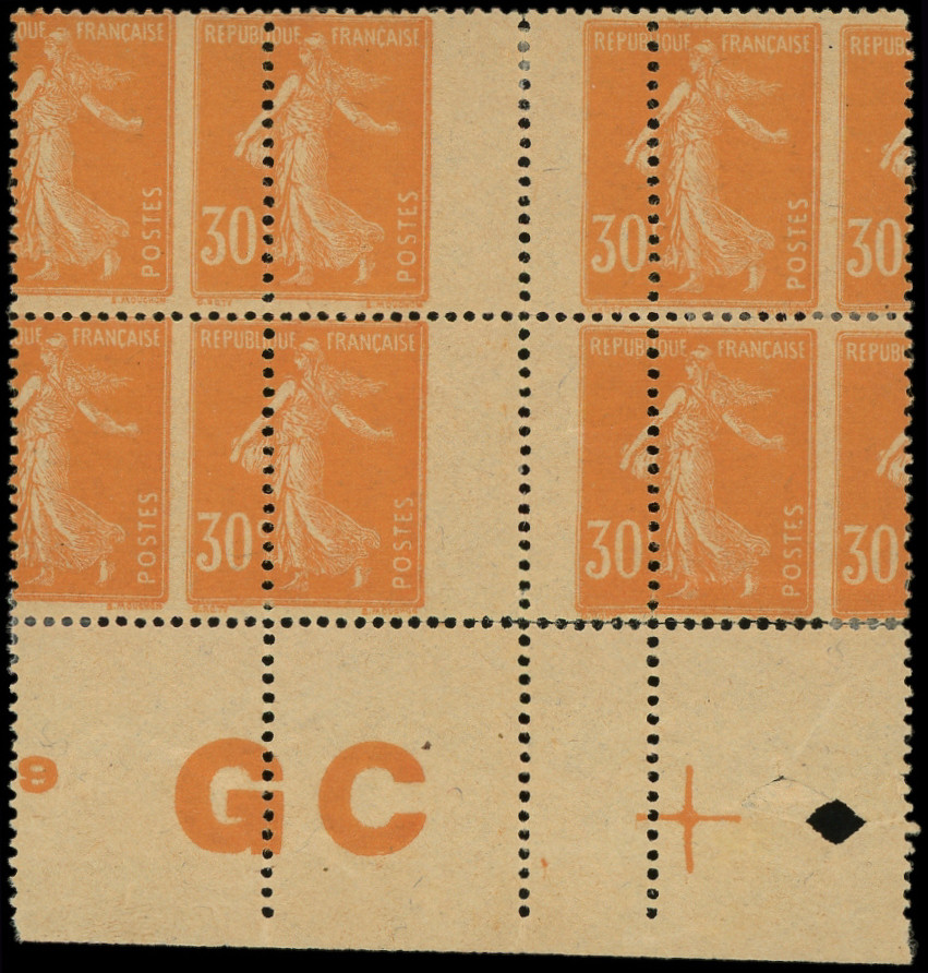 Camée, 30c. orange, Papier GC, PIQUAGE à CHEVAL, BLOC de 6 bas de feuille manchette GC et croix de repère, 1 ex. **, TB, cote Maury (Image)