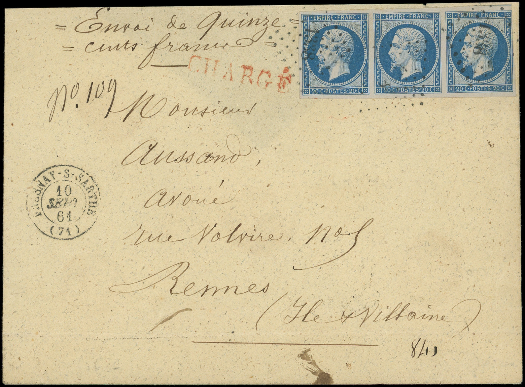 II, BANDE de 3 obl. PC 1338 s. Env. CHARGE, càd T15 FRESNAY-S-SARTHE 10/9/61, Superbe (Image)