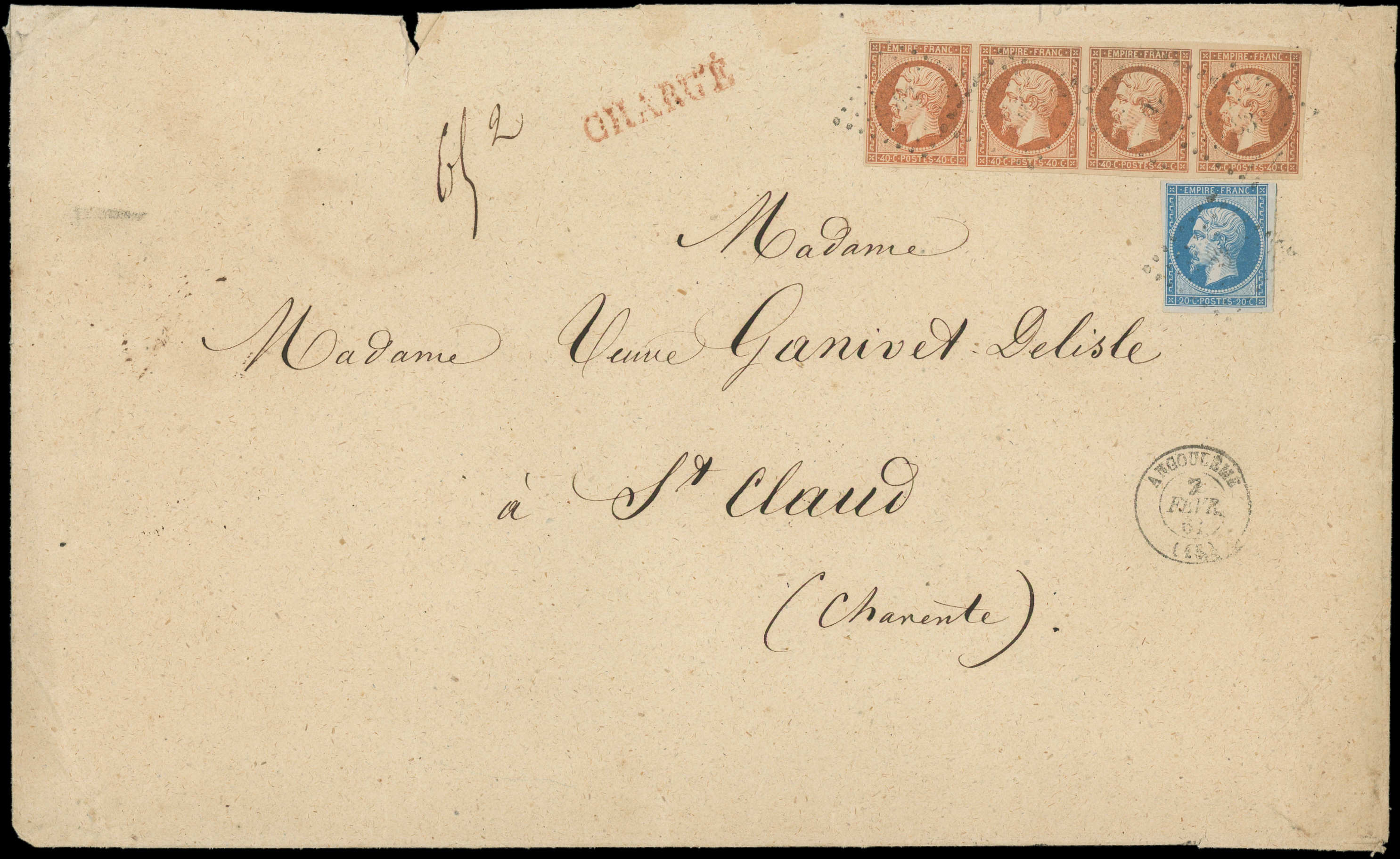 bleu T II et 40c. orange BANDE de 4, obl. PC 83 s. Env. CHARGE 4e échelon, càd T15 ANGOULEME 2/2/61, combinaison RR et TB (Image) (Image2)