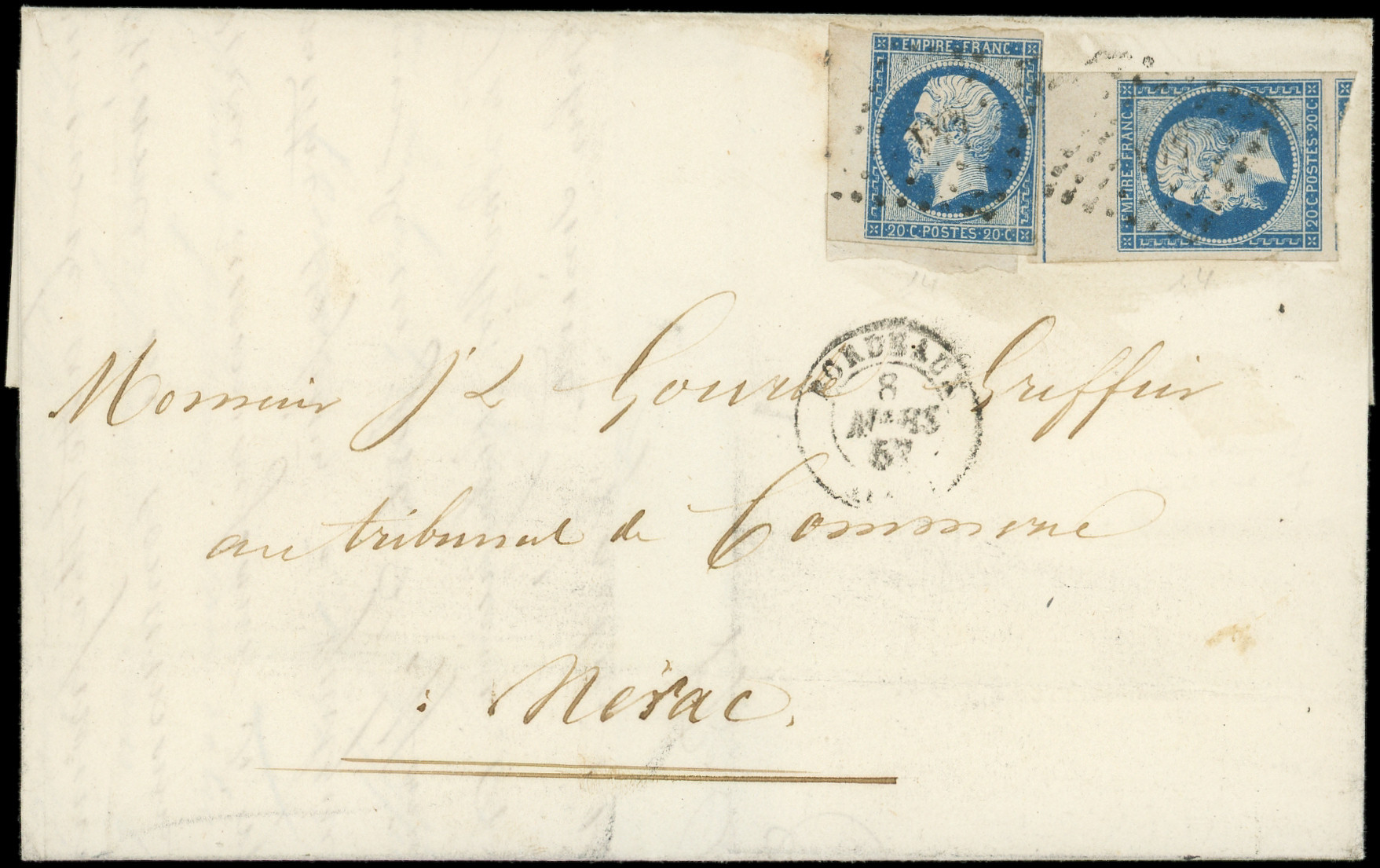 bdf avec FILET d'ENCADREMENT + 1 autre ex. bdf, obl. PC 441 s. LAC, càd T15 BORDEAUX 8/3/57, combinaison Rare et TB, certif JF Brun (Image)