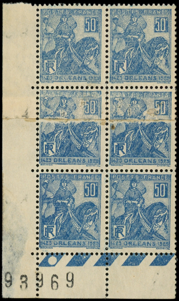 d'Arc, 50c. bleu, 2 ex. impression s. RACCORD dans un BLOC de 6 cdf N°93969, Superbe (Image)