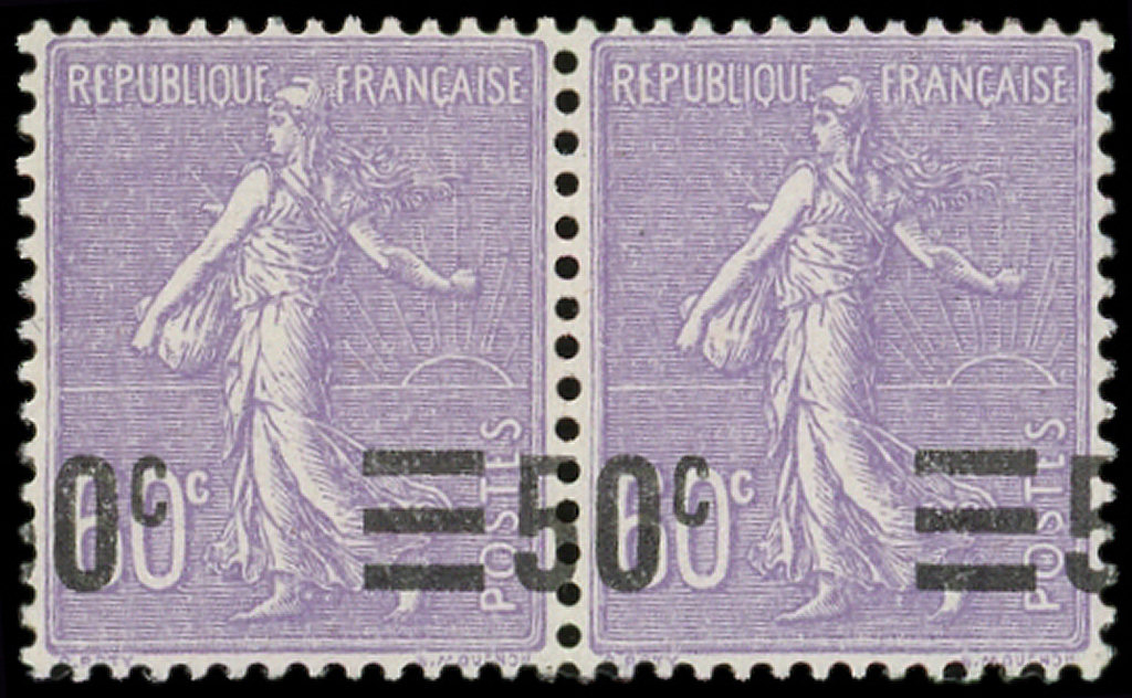 Lignée, 50c. s. 60c. violet, PAIRE VALEUR sur VALEUR et A CHEVAL, 0c. à gauche, 5 à droite, TB (Image)