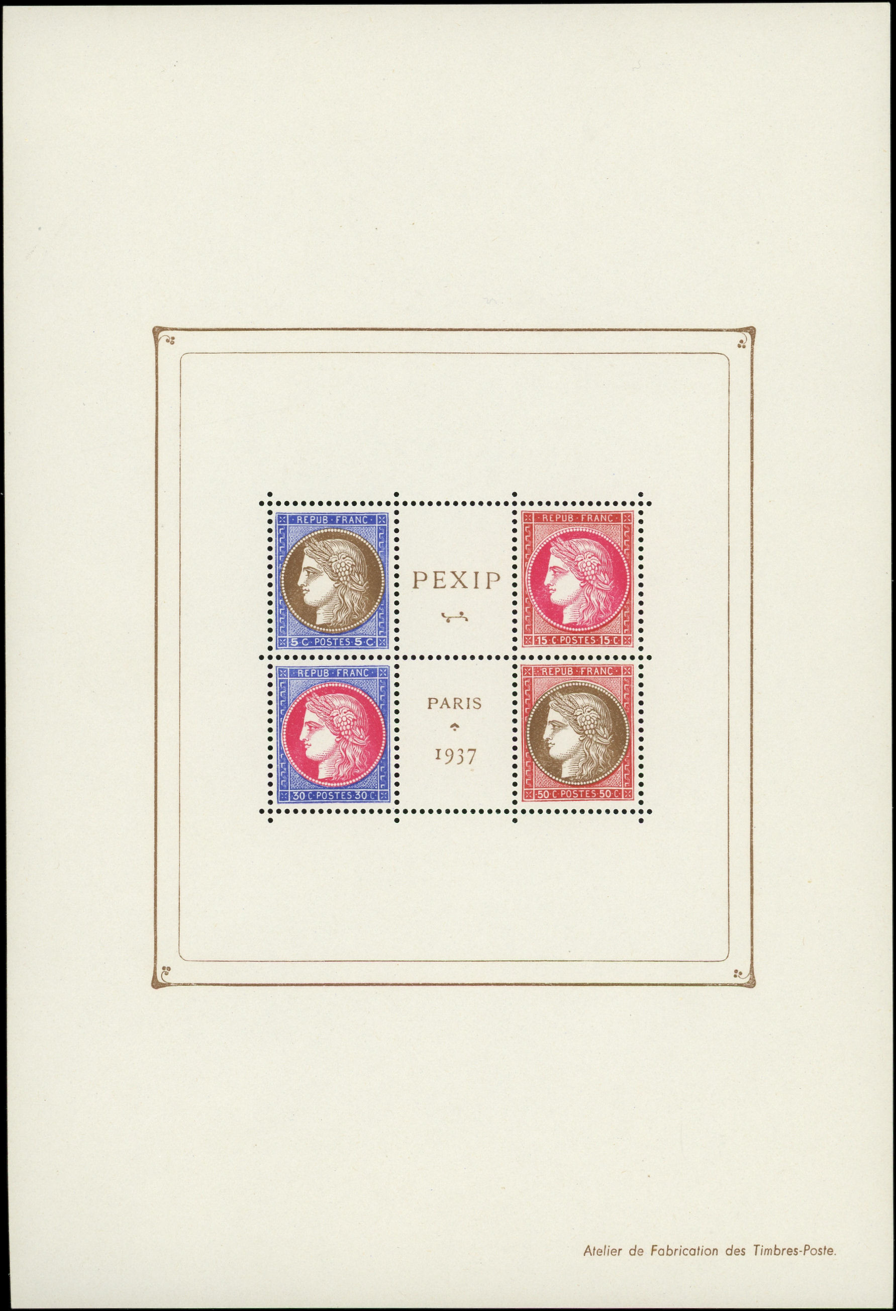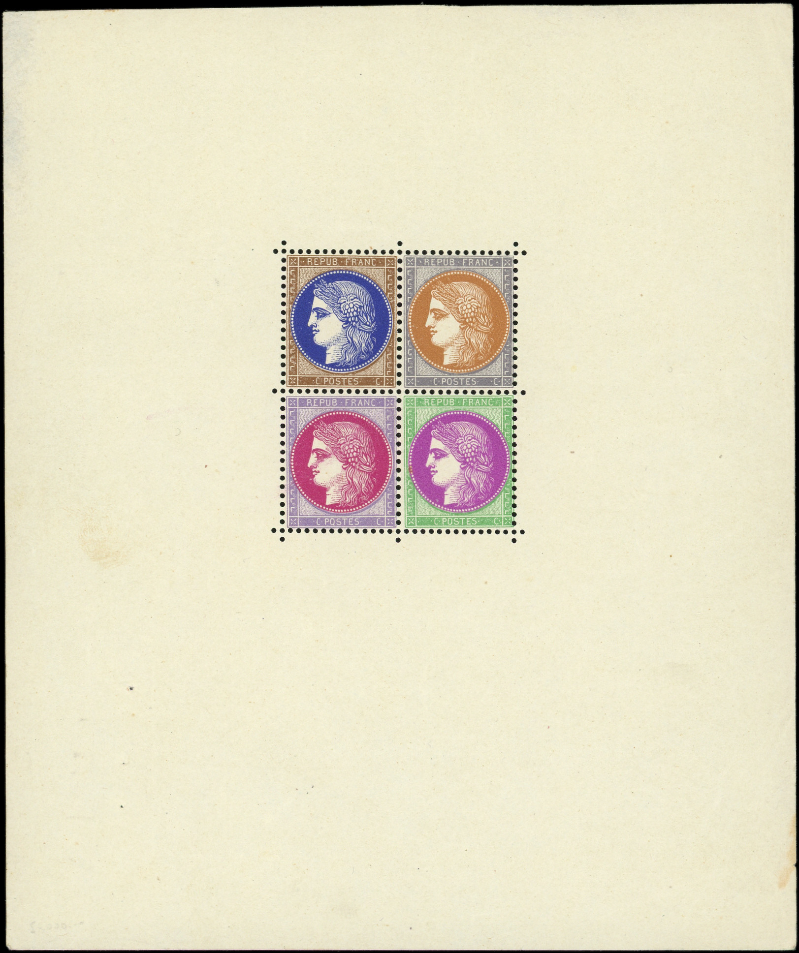 feuillet 135 x 160 avec au centre bloc de 4 timbres couleur différentes sans valeur faciale, RR, TB (Image)