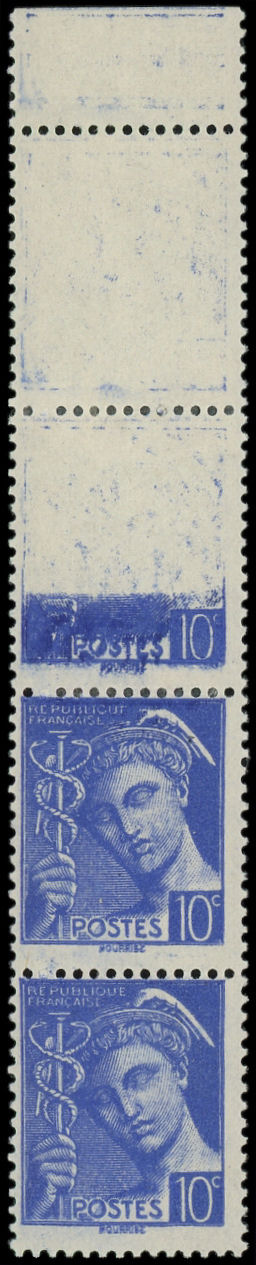 10c. outremer, BANDE de 4, 1 timbre SANS impression, 1 autre aux 2/3 et maculé, TB (Image)