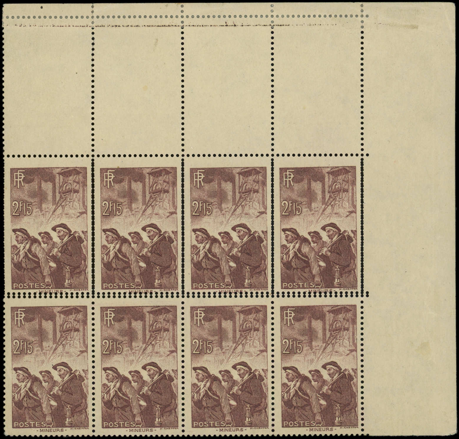 2f.15 brun-lilas, BLOC de 8 cdf, PIQUAGE horizontal DOUBLE, Superbe. C (Image)