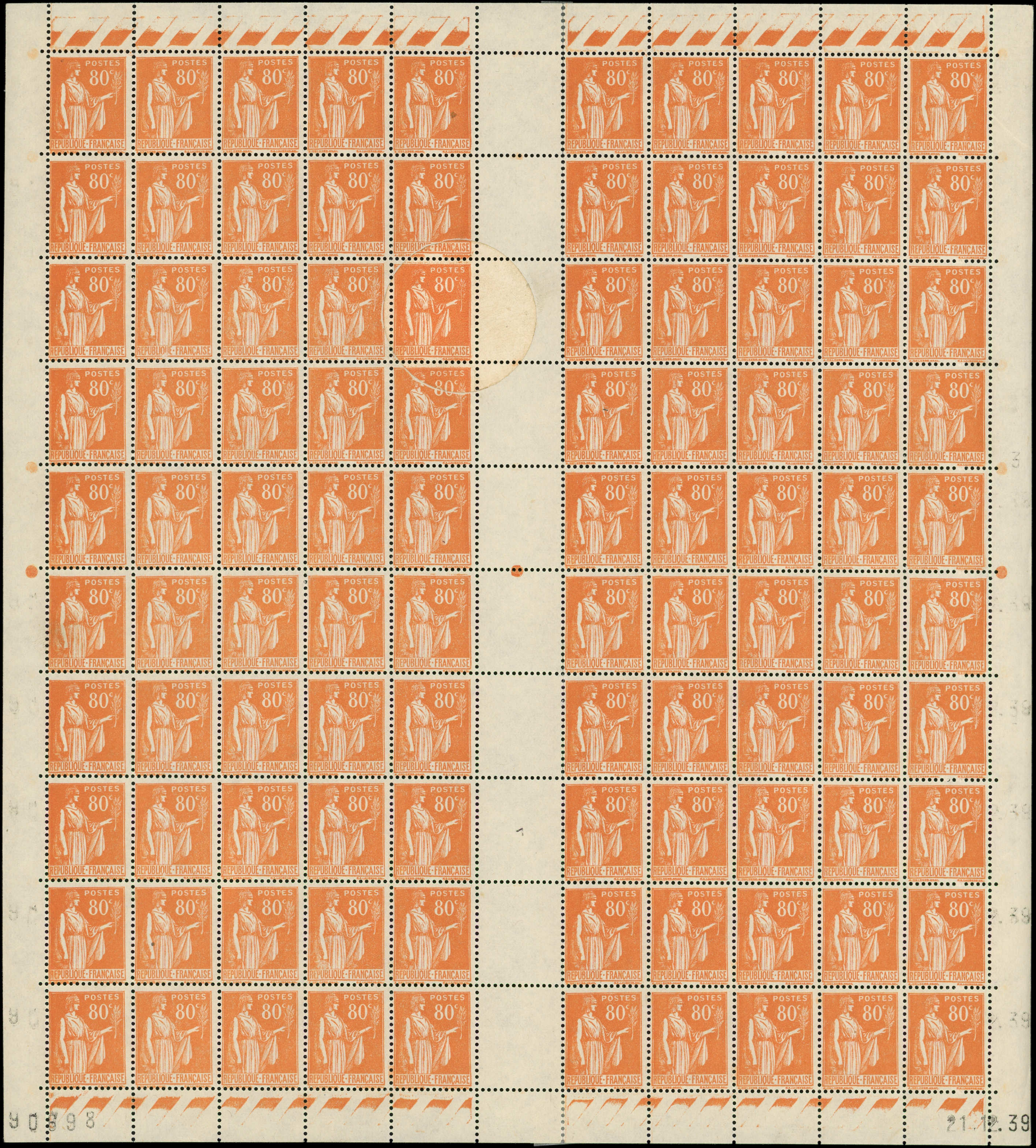 orange, FEUILLE de 100, impression sur RACCORD sous forme d'une pastille ronde de 35 mm de diamètre. Ceci pour masquer une tache grasse survenue lors de l'impression. Jamais rencontré auparavant, TB (Image)