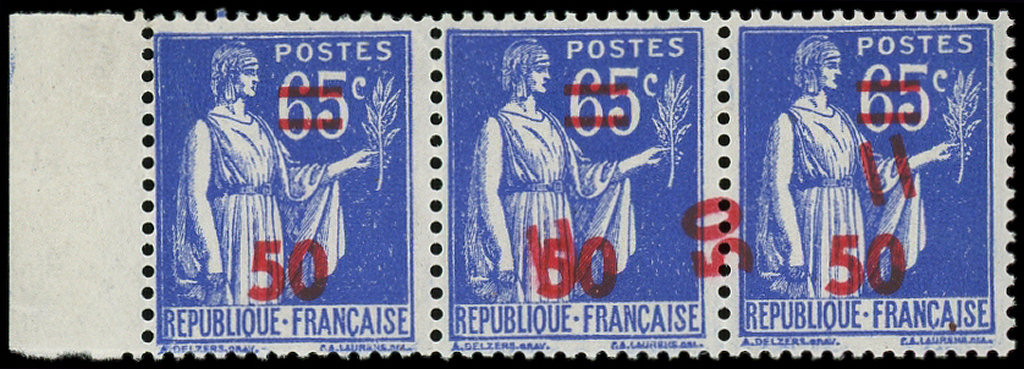 65c. bleu, DOUBLE surcharge dont une verticale sur 2 ex. dans une BANDE de 3 bdf, RR et TB (Image)