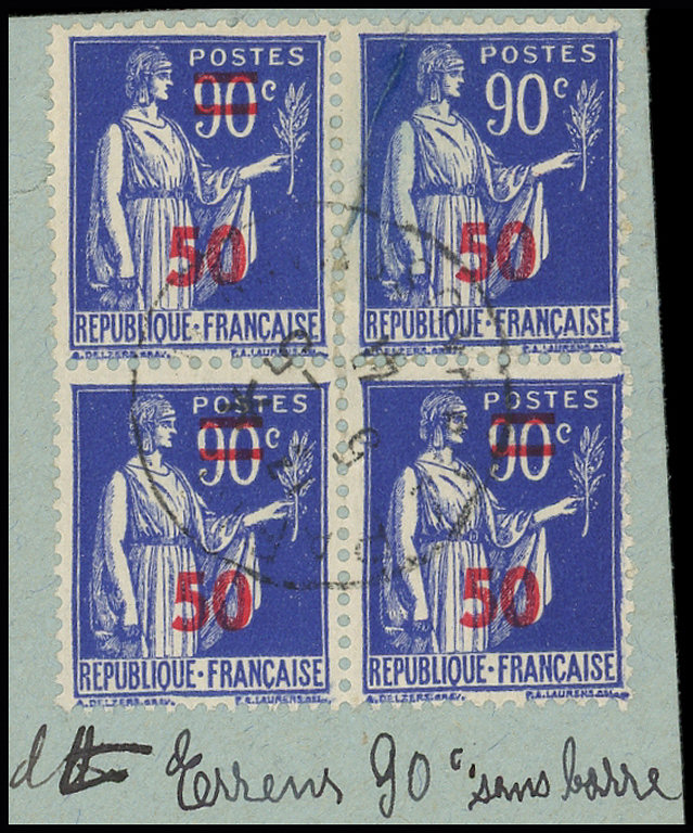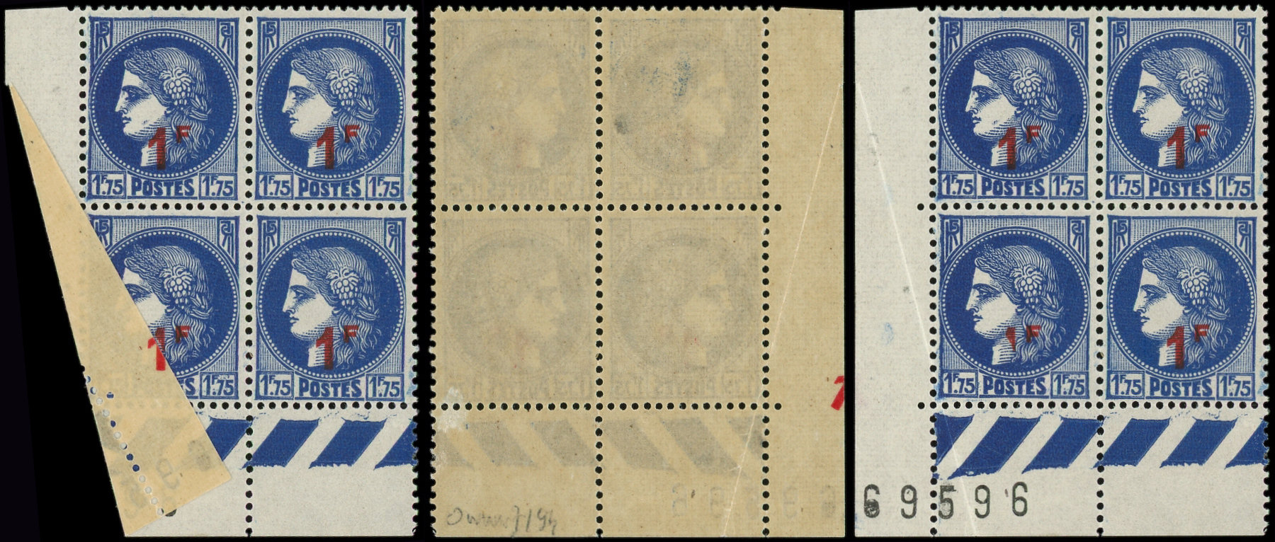 s. 1f.75 bleu, surcharge partiellement AU VERSO par pliage, dans un BLOC de 4, TB (Image)