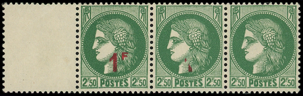 s. 2f.50 vert, BANDE de 3 bdf, 1 ex. SANS surcharge, 1 ex. "1" partiel, TB (Image)