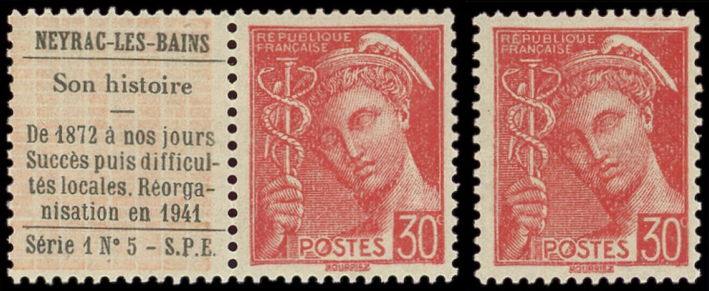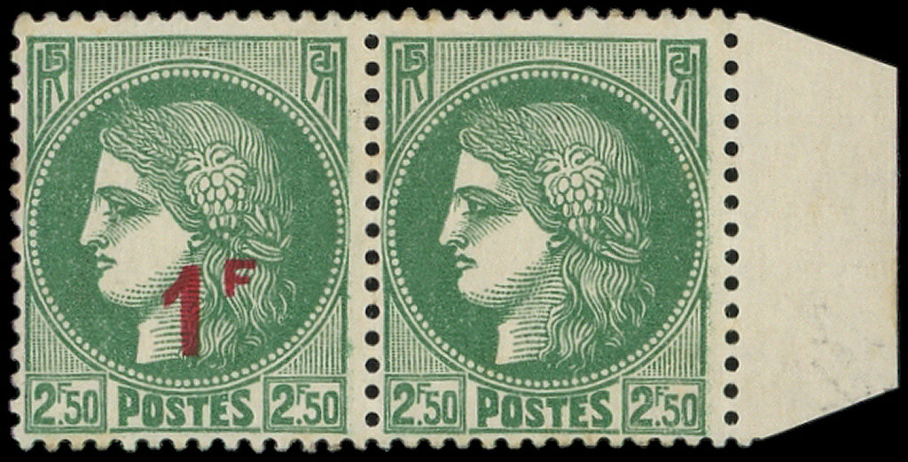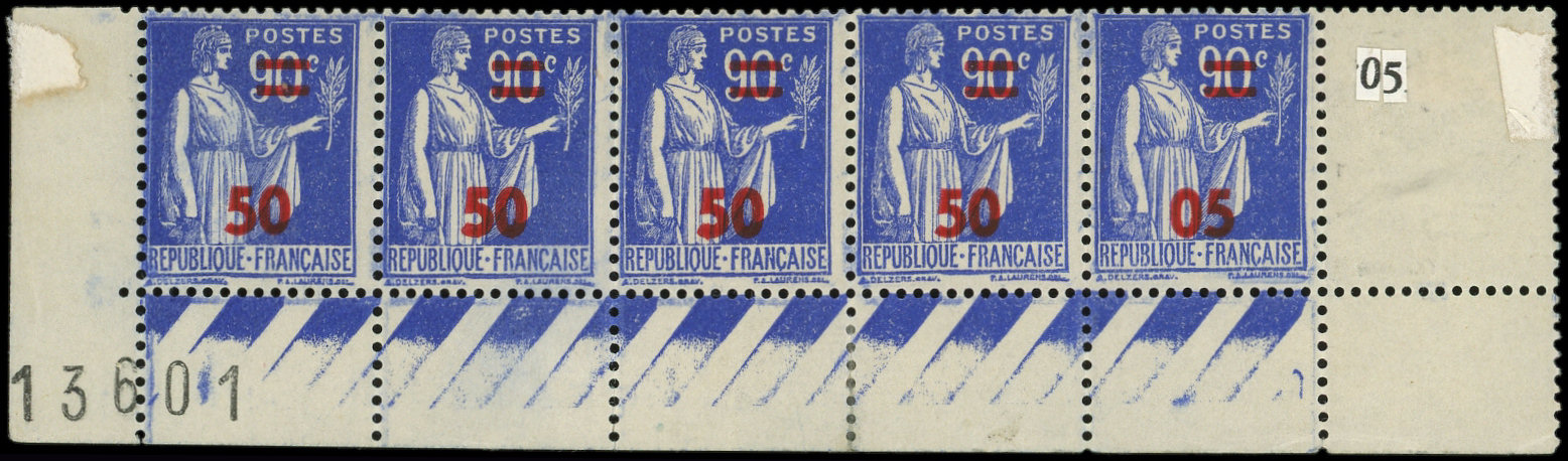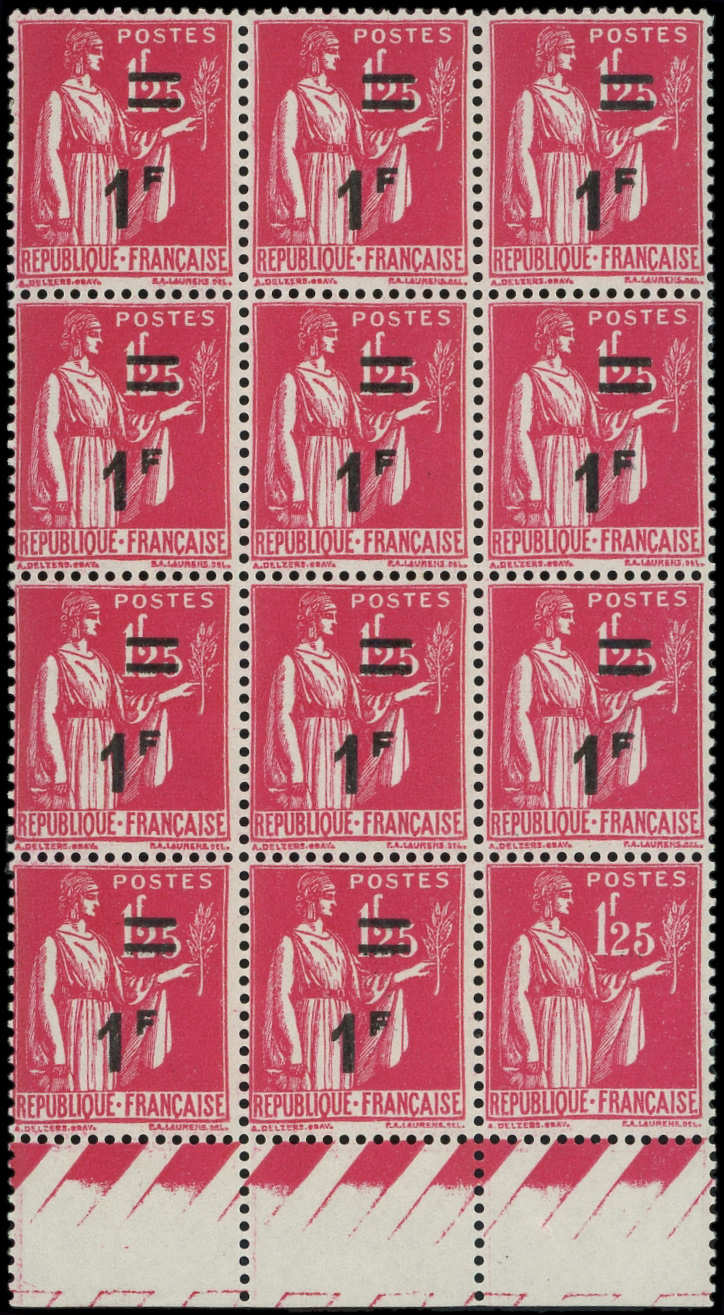 s. 1f.40 lilas, FEUILLE de 100 sauf bloc de 12 inf. gauche, CD 27/1/39. DOUBLE SURCHARGE progressivement donnant au moins 25 ex. avec cette variété. Ensemble très spectaculaire et RR, TTB. C (Image)