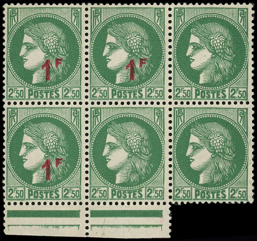 s. 2f.50 vert, BLOC de 6 dont 3 ex. SANS surcharge, 2 t. *, RR, TB (Image)