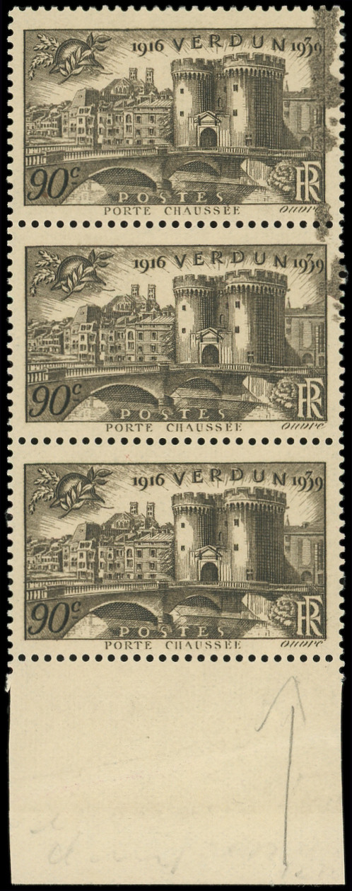 90c. brun, BANDE de 3 bdf, 2 ex. impression MACULEE (1 ex. *), TB (Image)