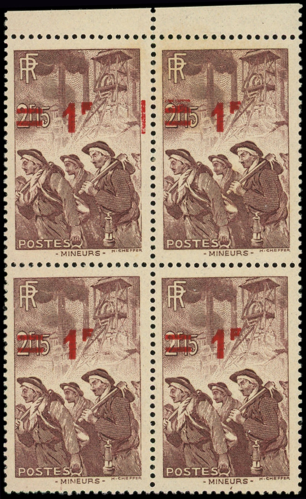 1f. s. 2f.15 brun, BLOC de 4 bdf, 1 ex. amorce de DOUBLE IMPRESSION, 1 ex. barre verticale rouge à droite, TB (Image)