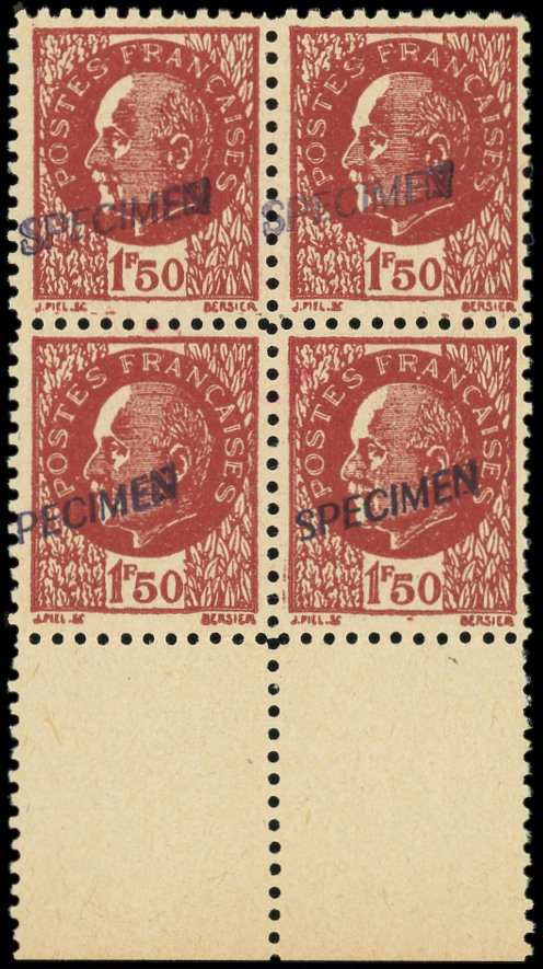 1f.50 brun-rouge, FAUX F.F.I, surchargé SPECIMEN en BLOC de 4 bdf, TB, signé Mayer (Image)