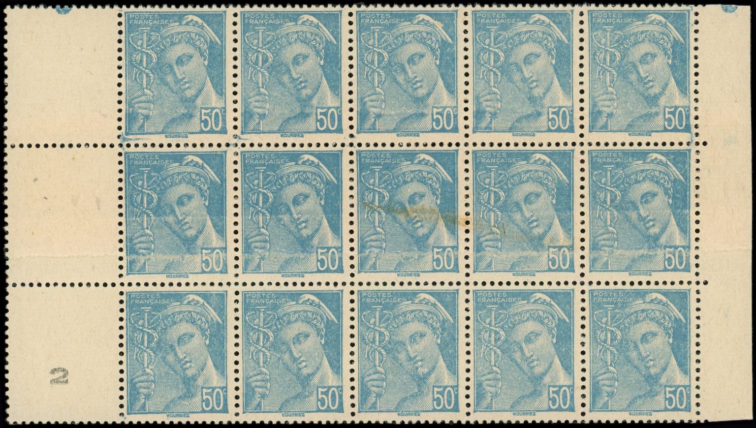 50c. turquoise, BLOC de 15 avec bord, 5 ex. IMPRESSION sur RACCORD, TB (Image)