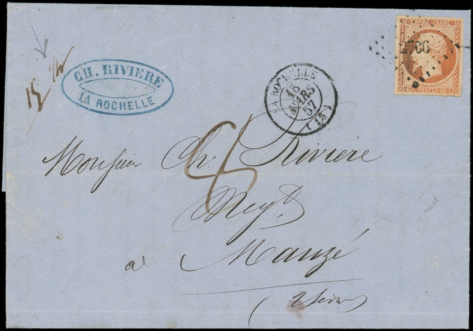 obl. PC 2706 s. LAC, càd T15 LA ROCHELLE 18/3/57, poids 15 1/4 inscrit sur la lettre d'où la TAXATION 8 à la plume, 1,20f. au delà de 15g... quelle rigueur à l'époque ! TTB