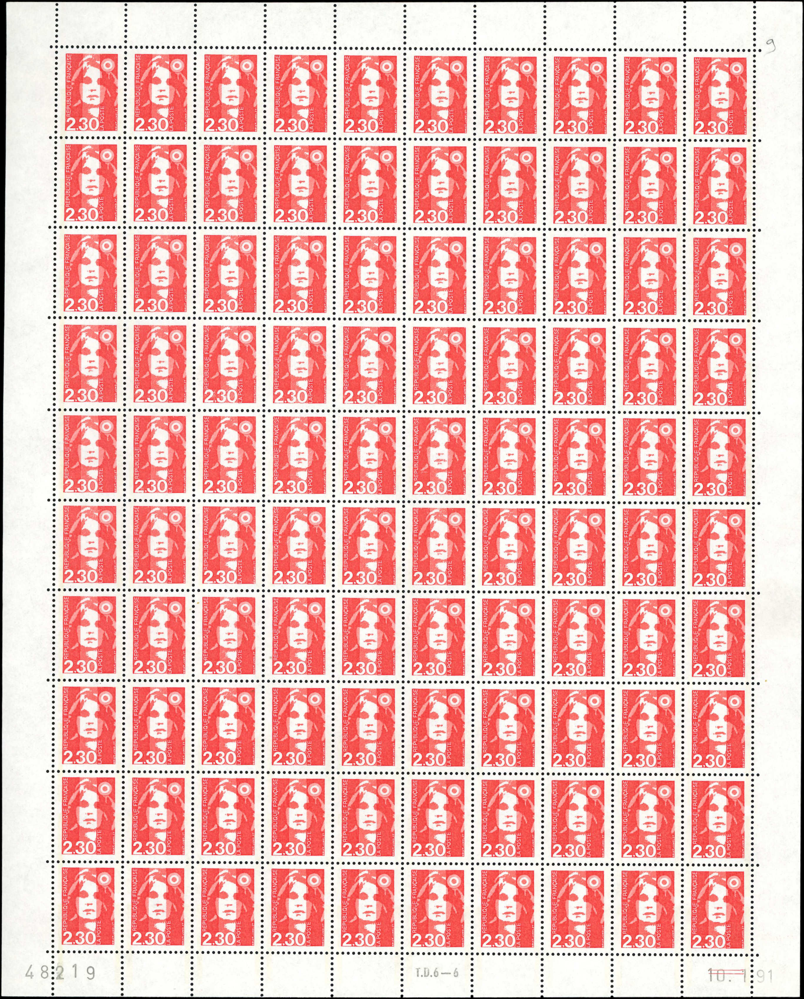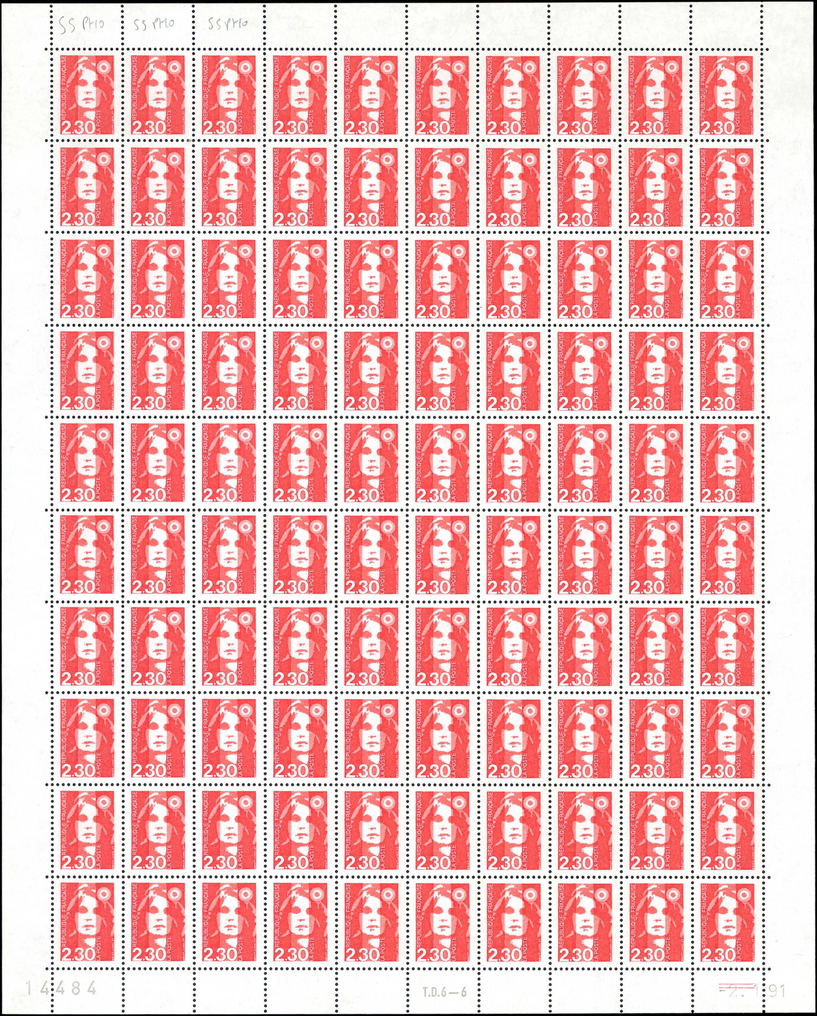 2,30 rouge, PHOSPHO à CHEVAL verticalement, FEUILLE de 100 TD6-6, CD 10/1/91, TB (Image)