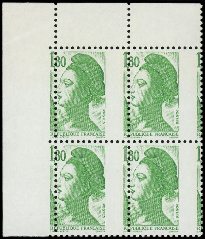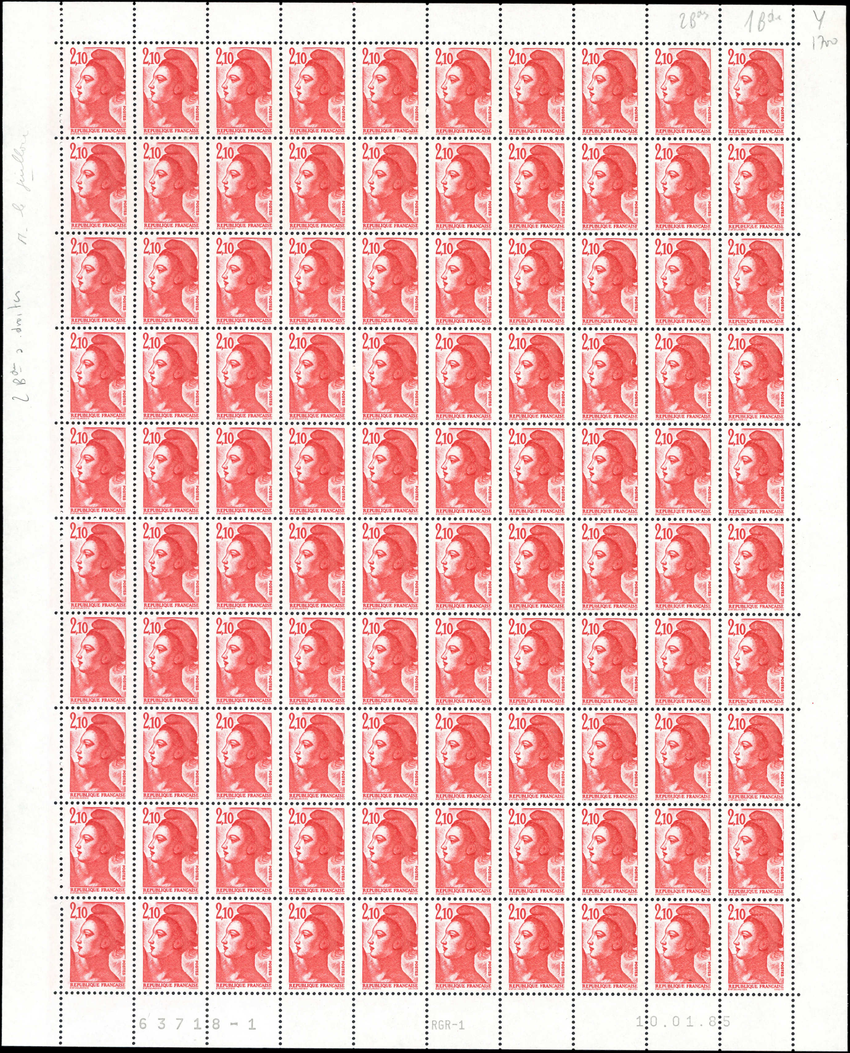 2,10 rouge, FEUILLE de 100 CD 10/1/85, 10 t. 1 bande à droite, tenant à 90 t. 2 bandes à droite, TB (Image)