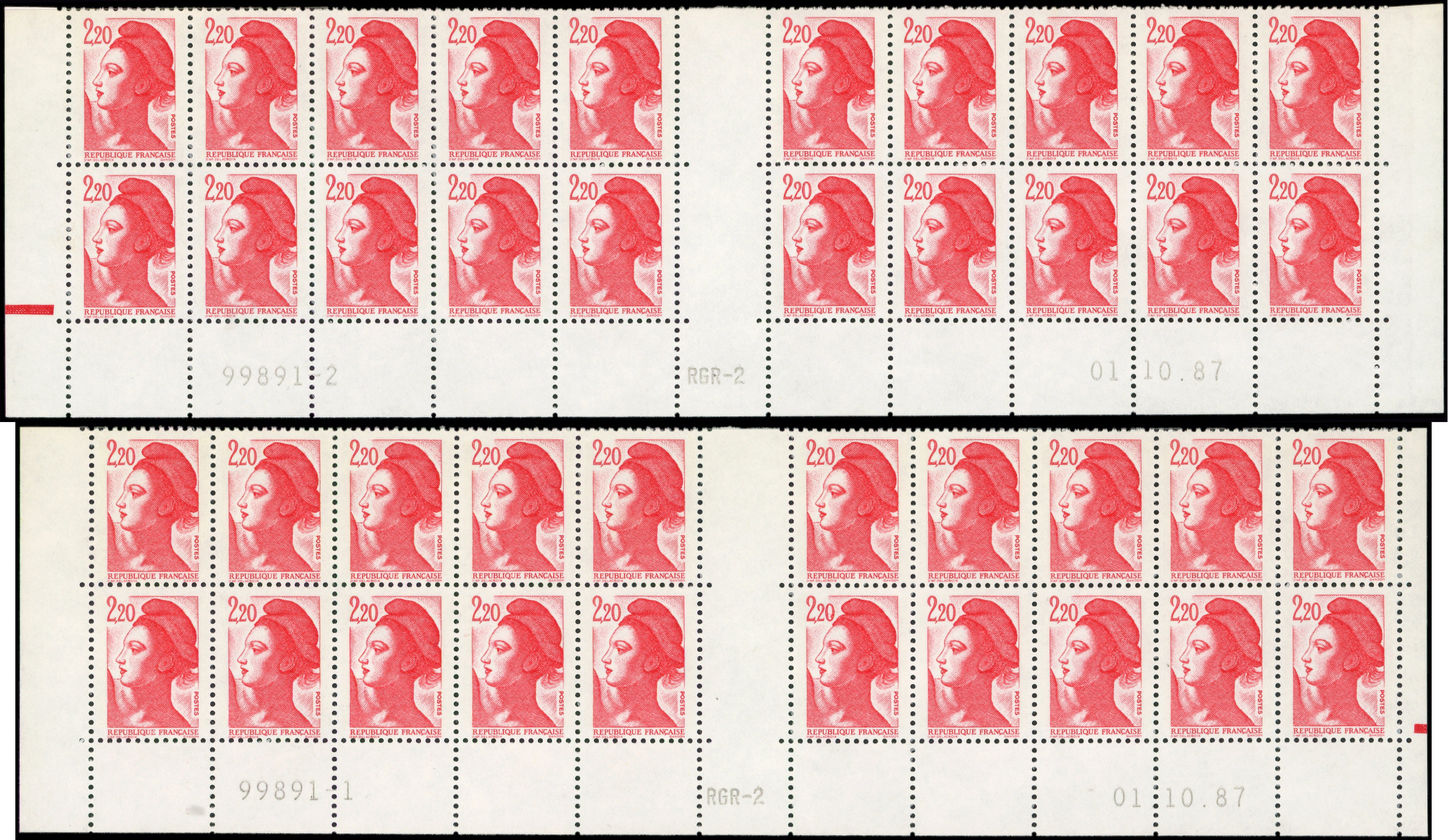 2,20 rouge, 2 BLOCS de 20 bas de feuille, RGR-2 CD 1/10/87, n°99891-1 et 99891-2, R et TB (Image)
