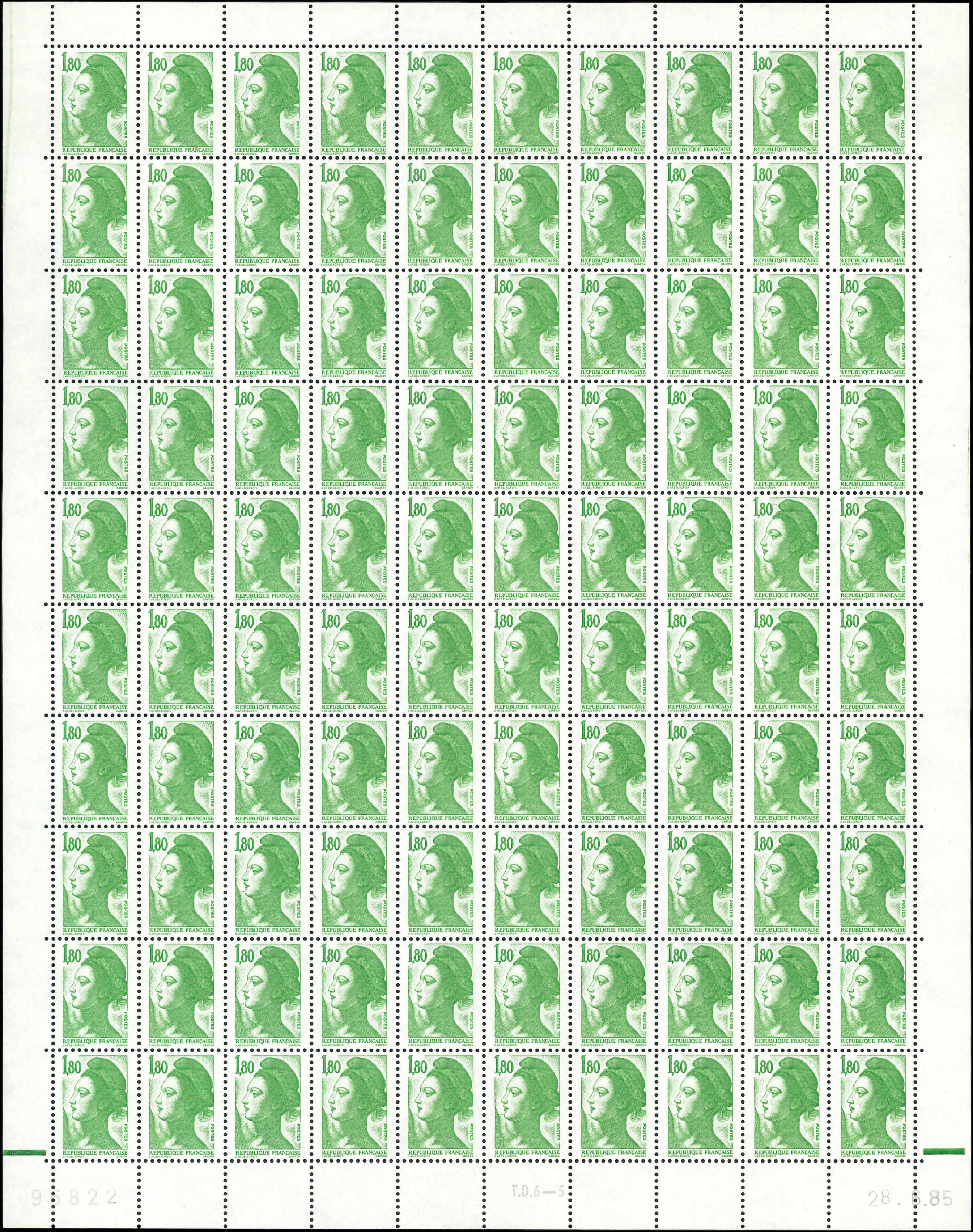1,80 vert, FEUILLE de 100 CD 28/6/85, SANS PHOSPHO, TB (Image)