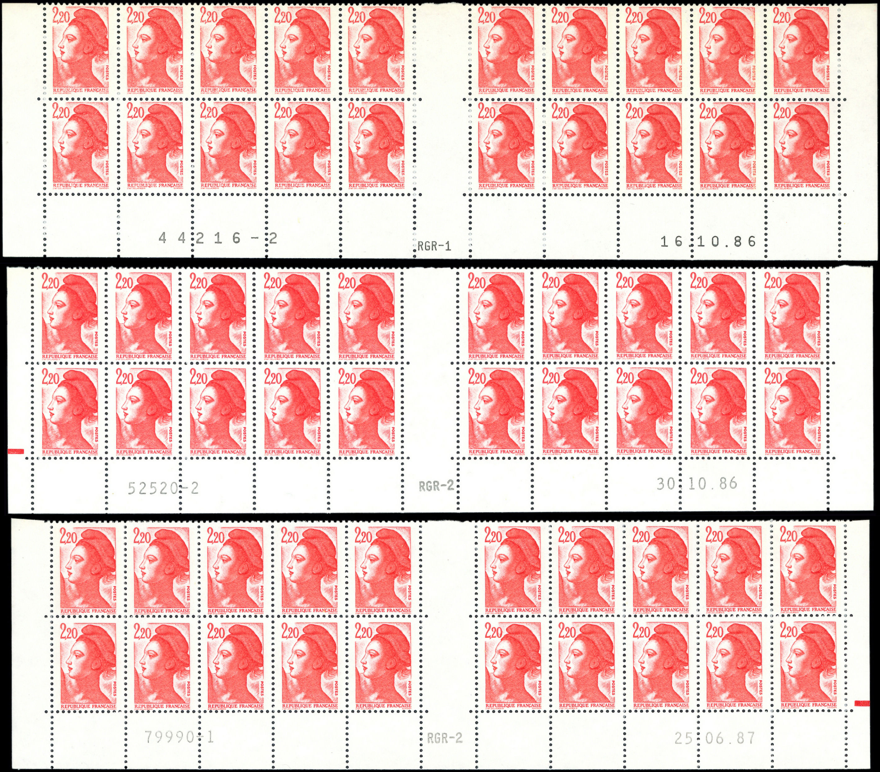 2,20 rouge, 3 BLOCS de 20 bas de feuille RGR-1 CD 16/10/86, RGR-2 CD 30/10/86 et RGR-2 CD 25/6/87 avec RE, TB (Image)