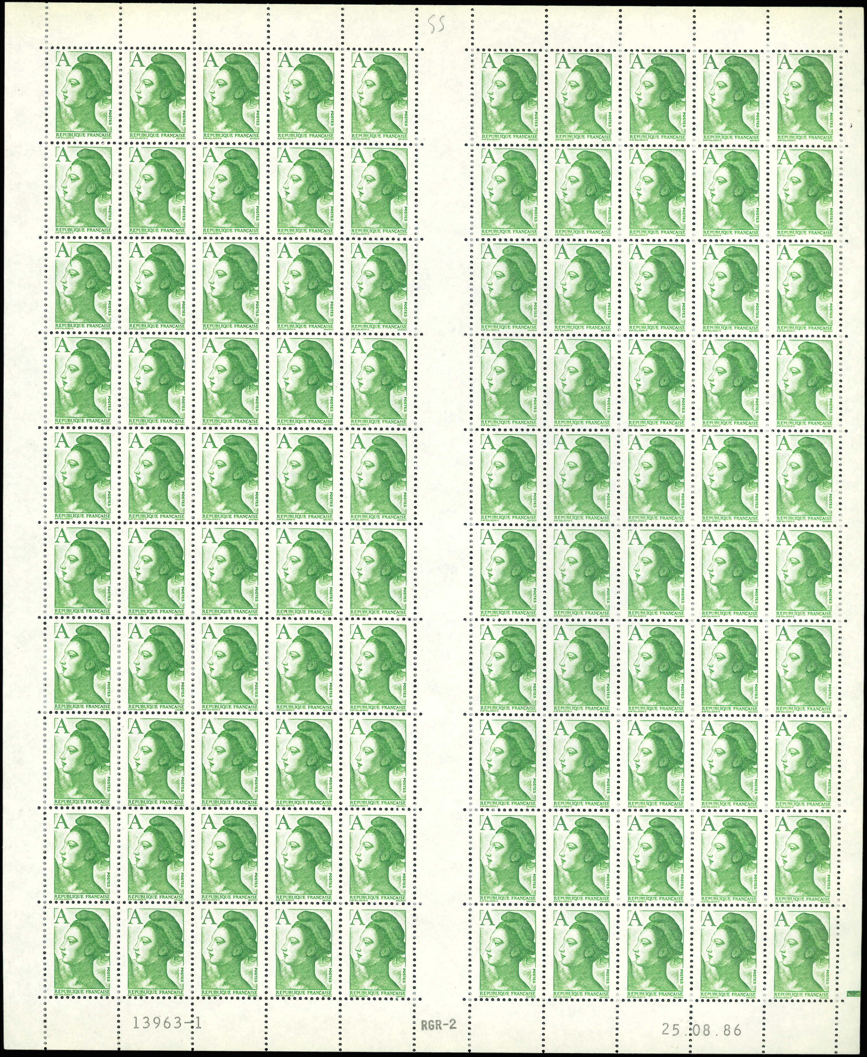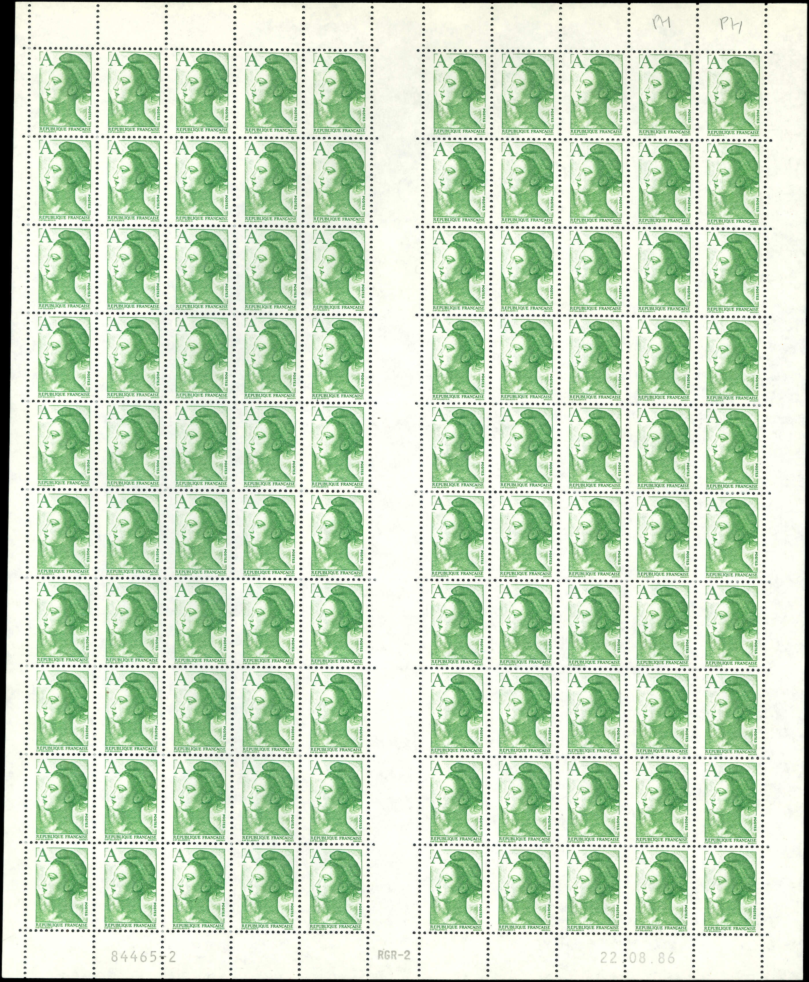 vert, SANS PHOSPHO, 2 feuilles de 100, RGR-2 CD 22/8/86 (2 colonnes avec phospho) et CD 25/8/86, TB (Image) (Image2)