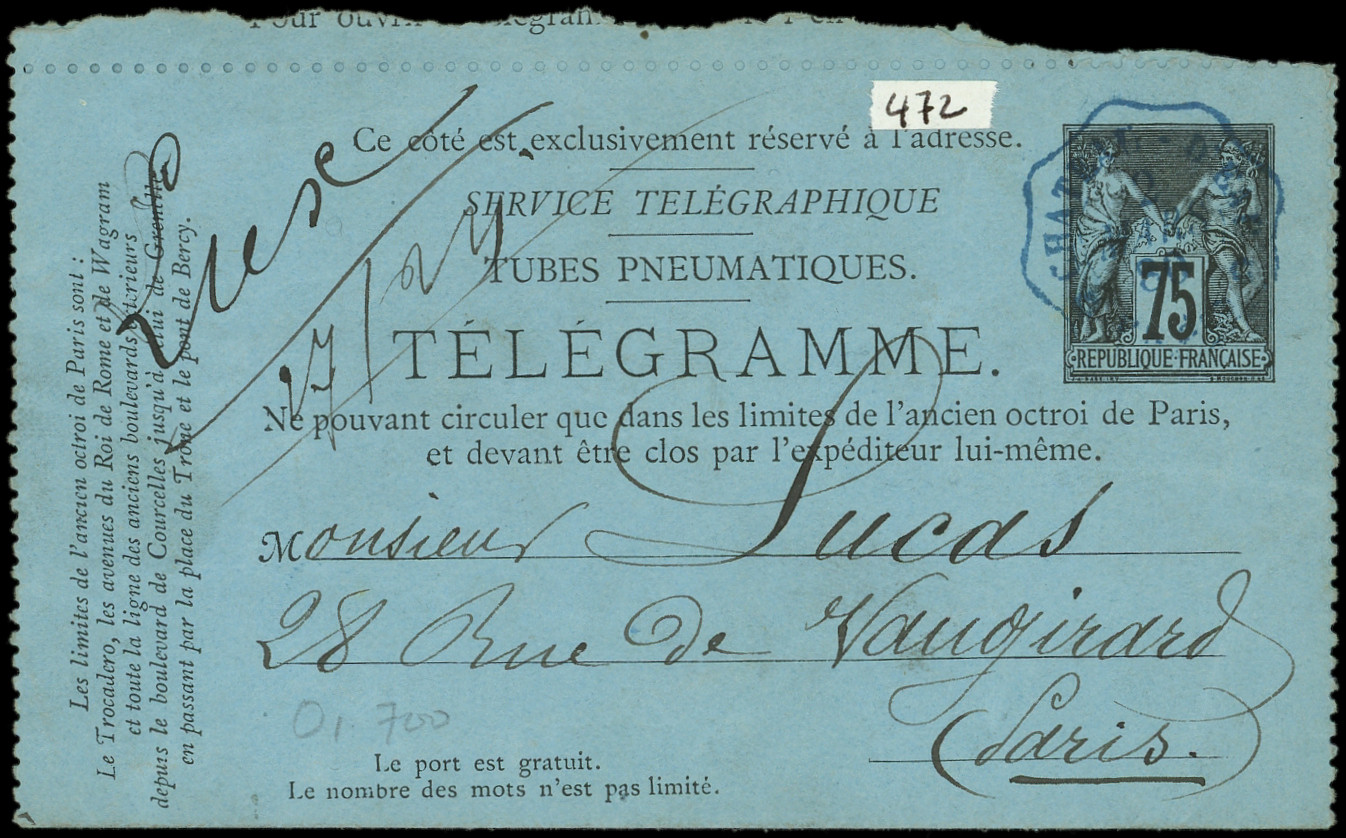s. bleu, Télégramme n°O1, obl. Conv. CHATEAU-D'EAU 3/80, TB (Image)