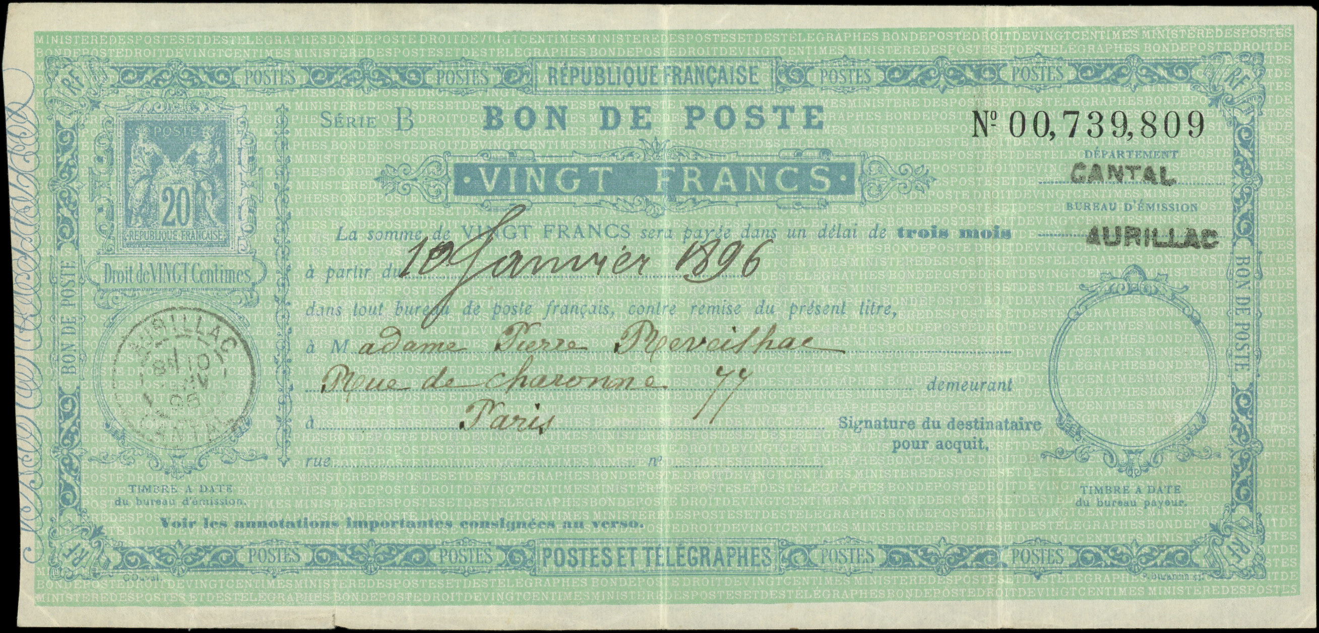 Bon de Poste n°K3, 20f. vert Série B càd AURILLAC 10/1/96, TB (Image)