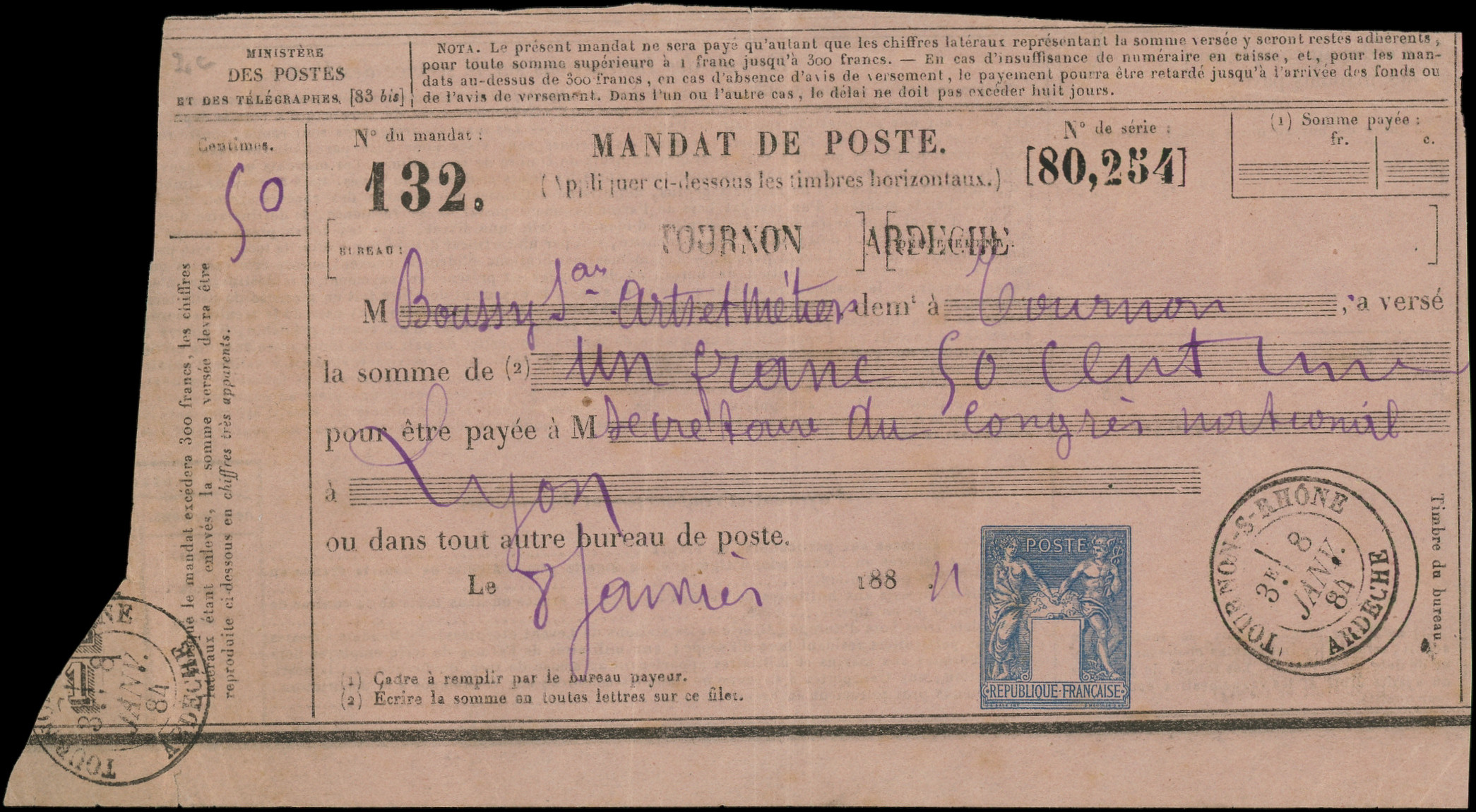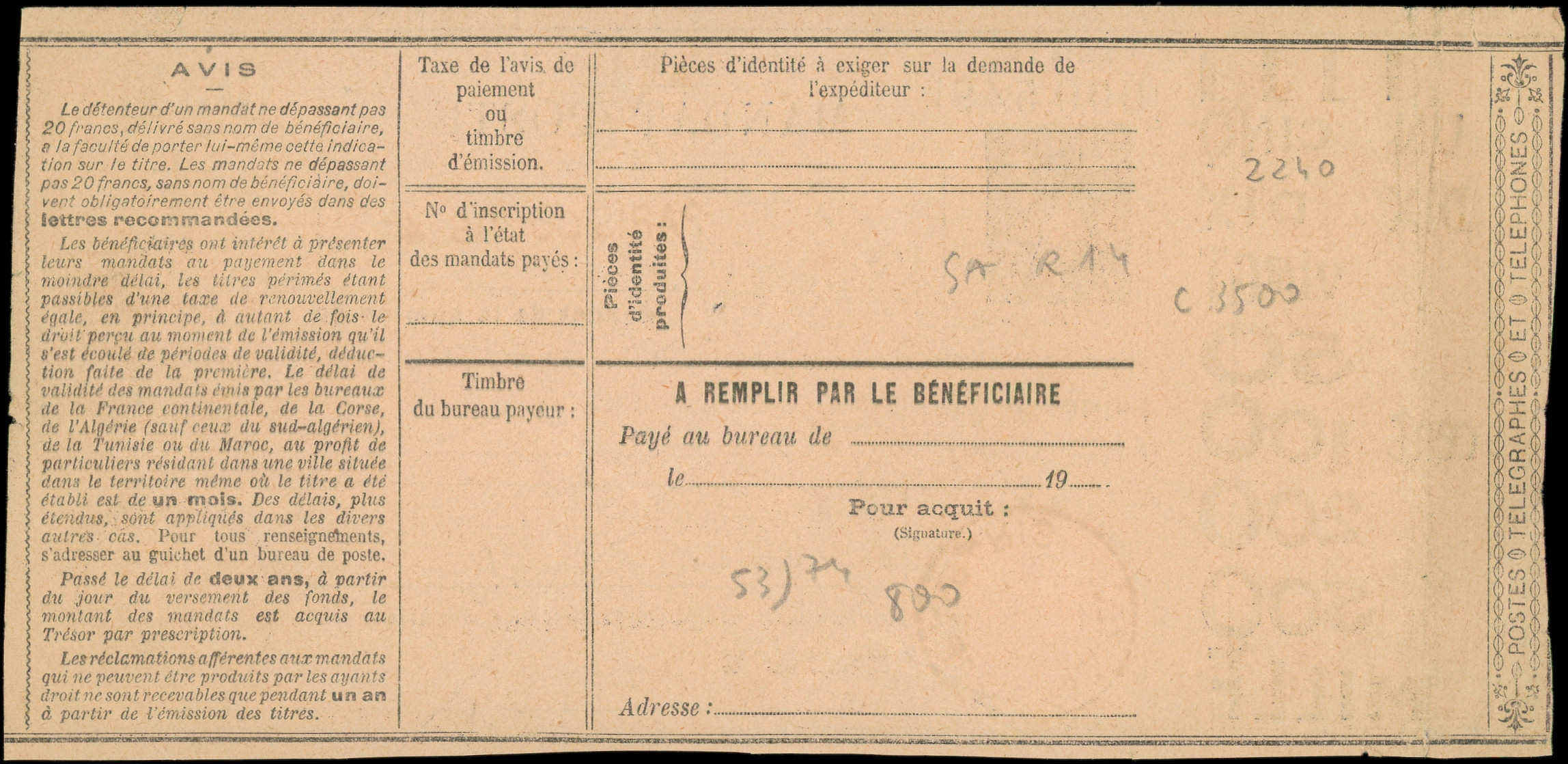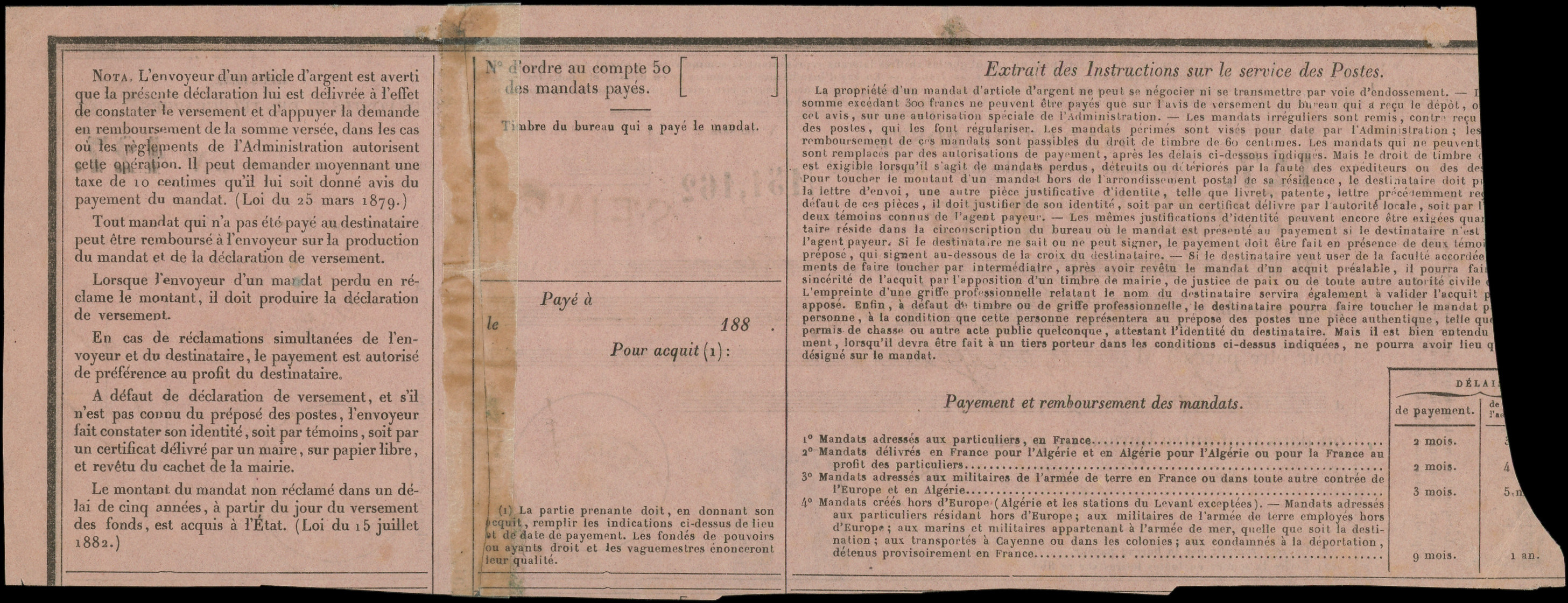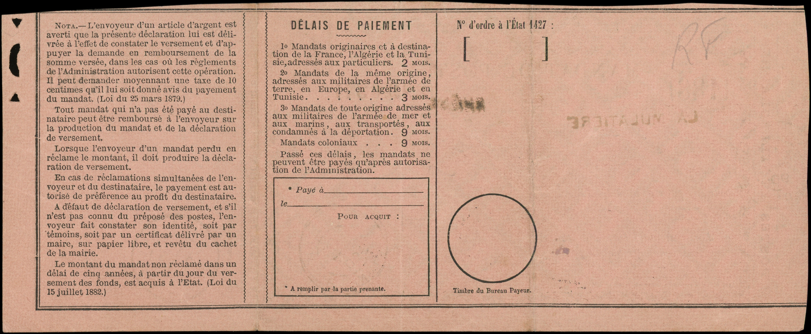 cartouche vide, Mandat n°P2, papier rose, chiffre 83 bis, obl., TB (Image)
