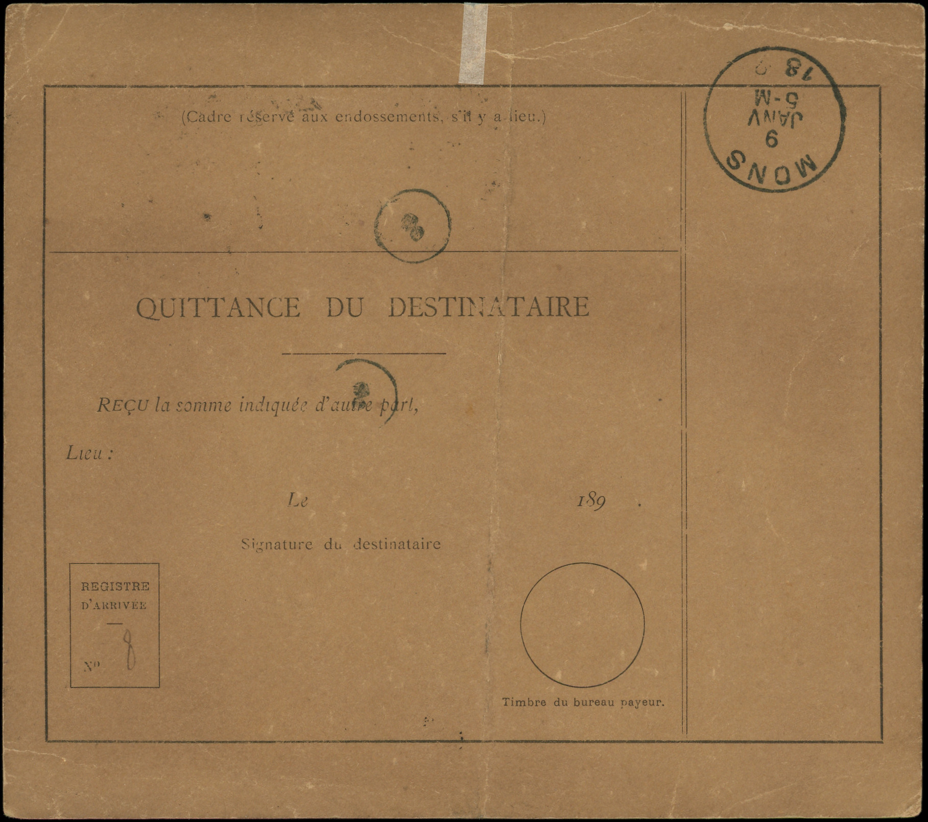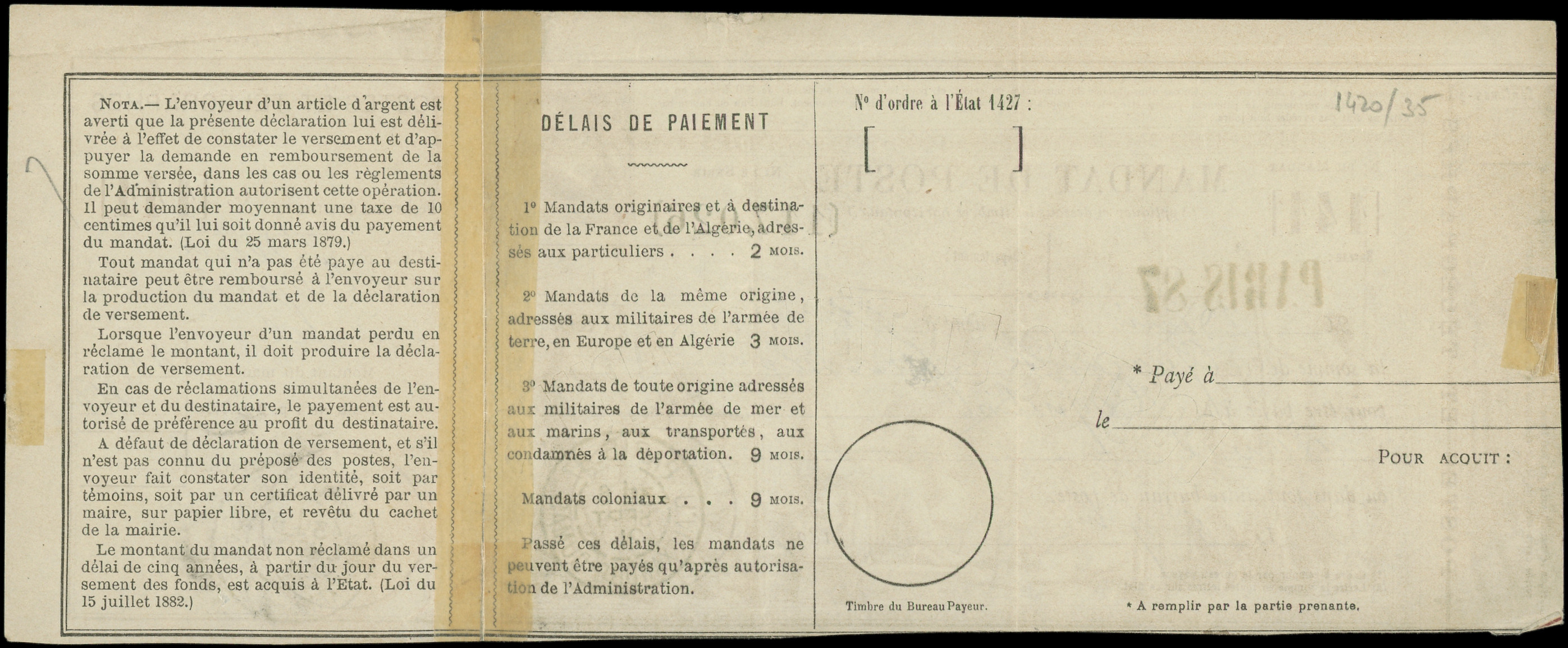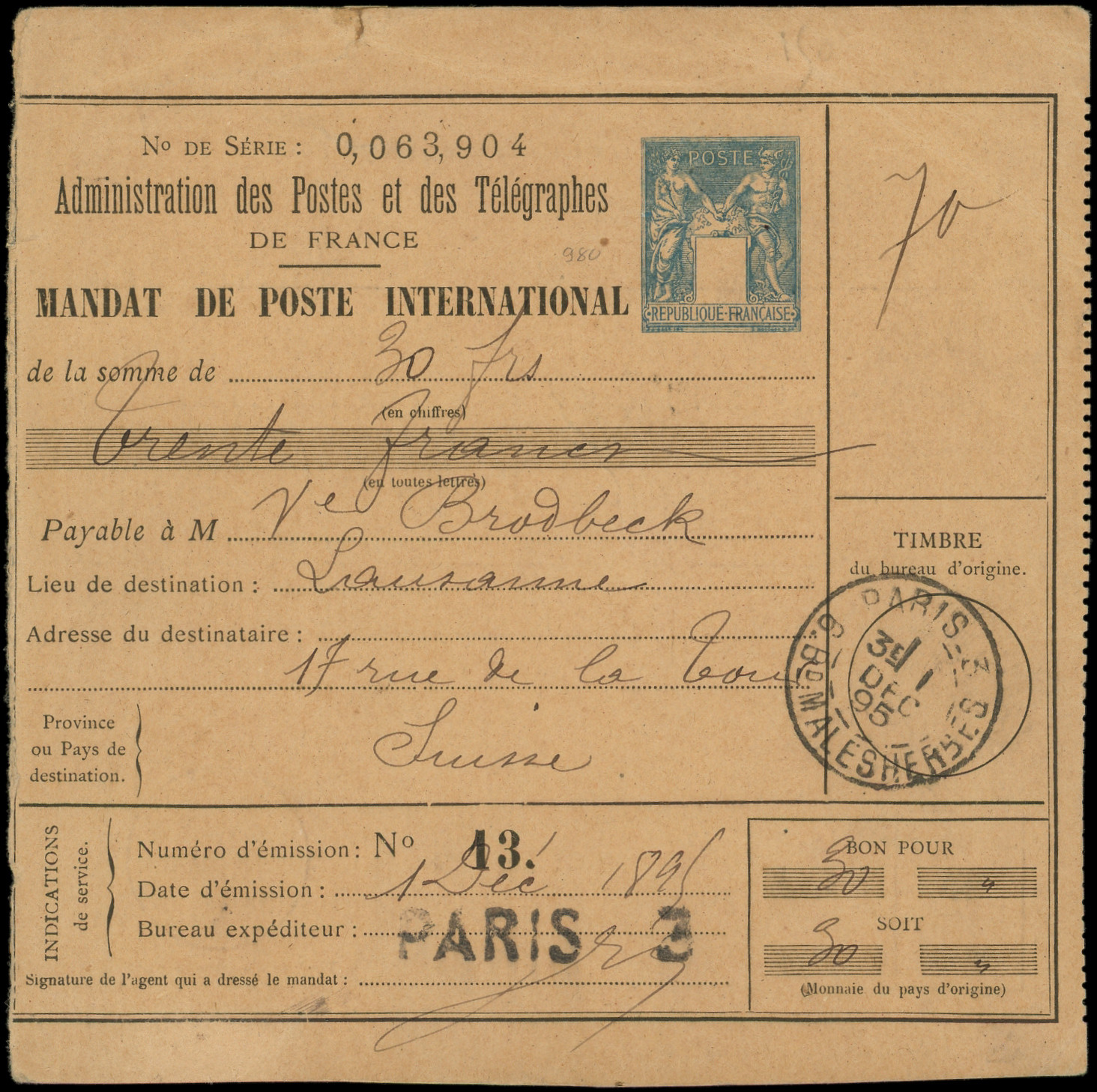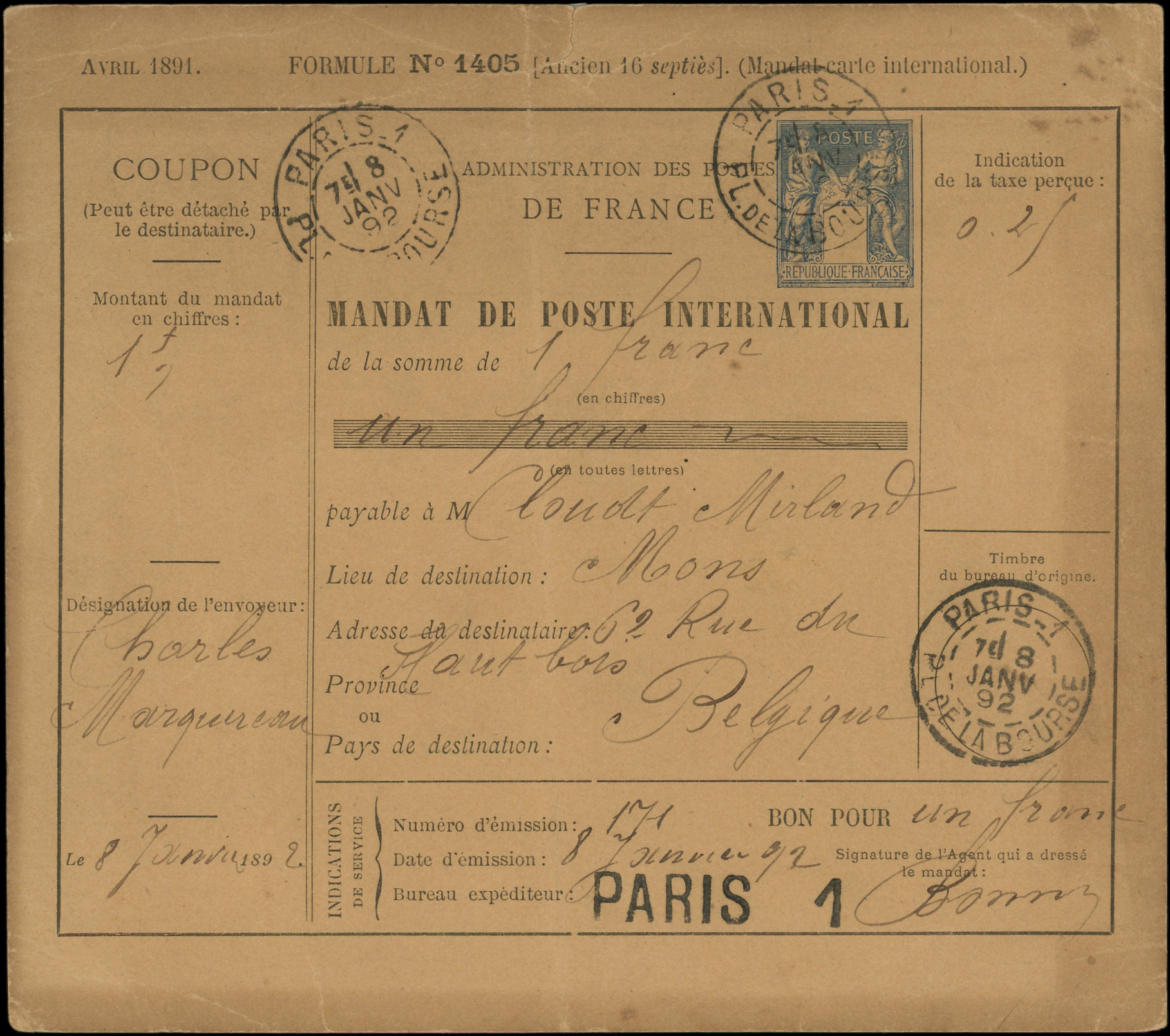 cartouche vide, Mandat International n°P7, Formule N°1405 Avril 1891, obl. PARIS-1 8/1/92, qqs défauts mais rare avec obl. s. timbre, TB (Image) (Image2)