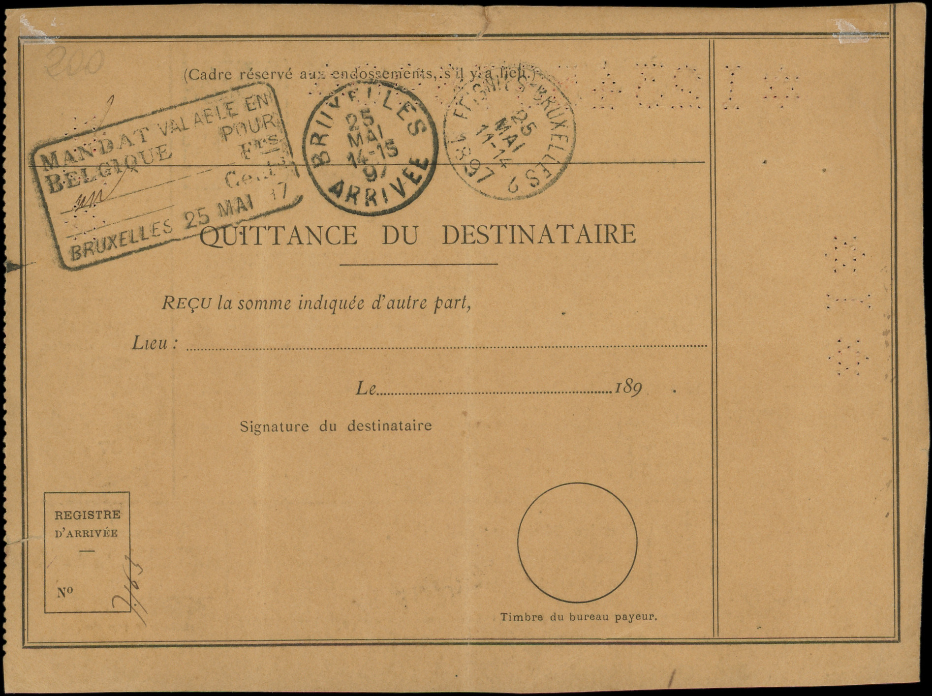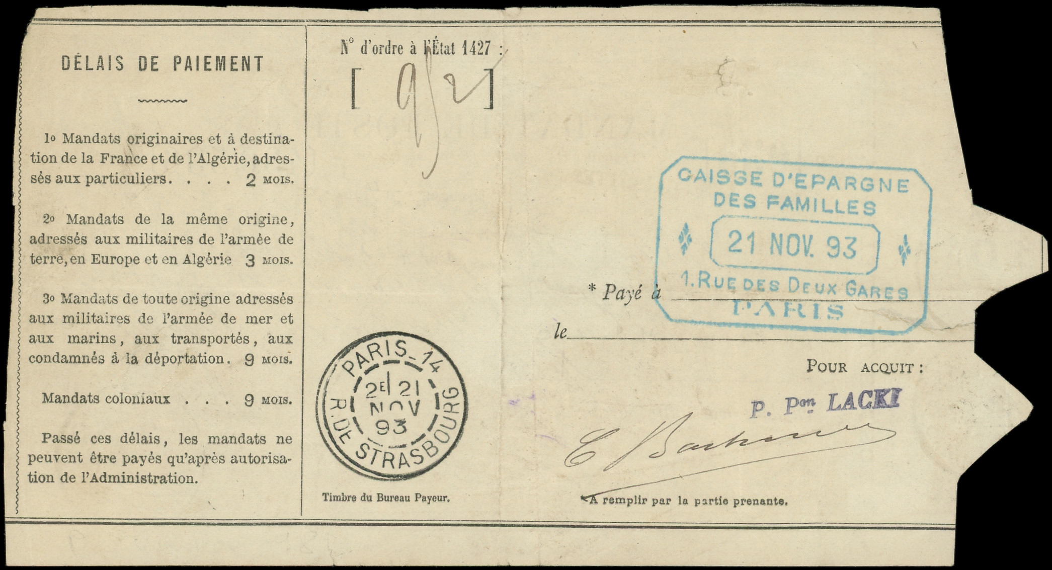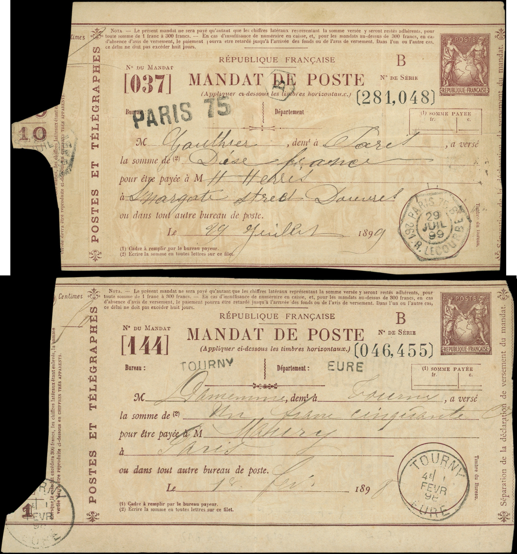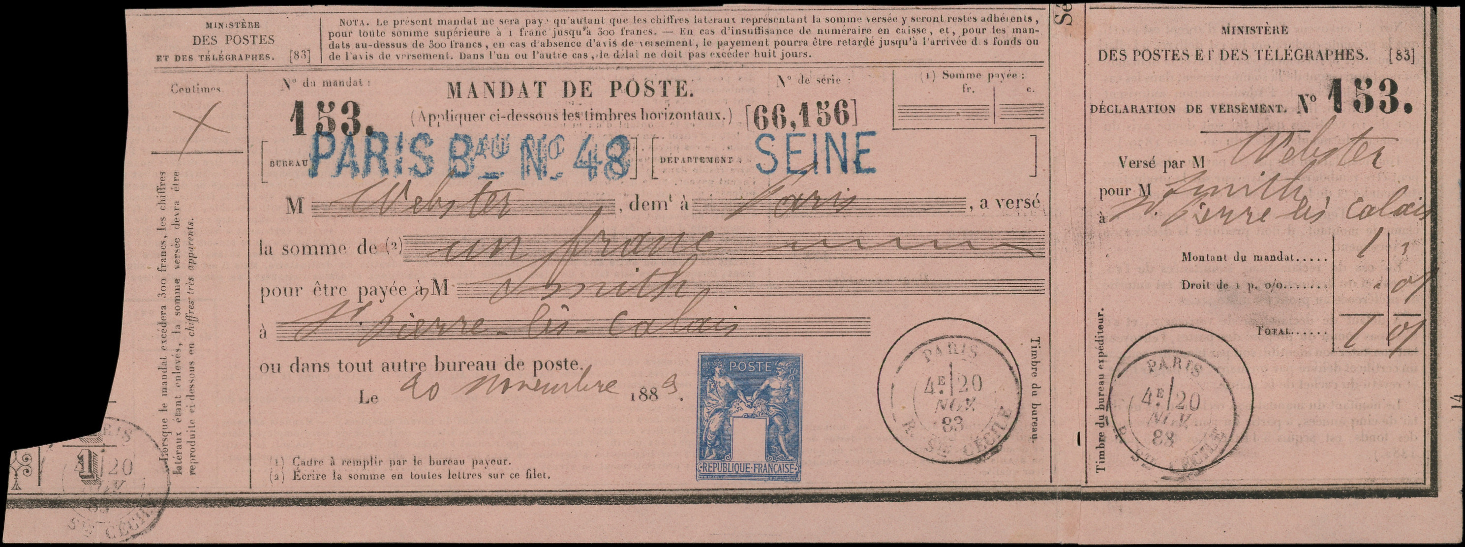 cartouche vide, Mandat International n°P7, Formule N°1405 Avril 1891, obl. PARIS-1 8/1/92, qqs défauts mais rare avec obl. s. timbre, TB (Image) (Image2)