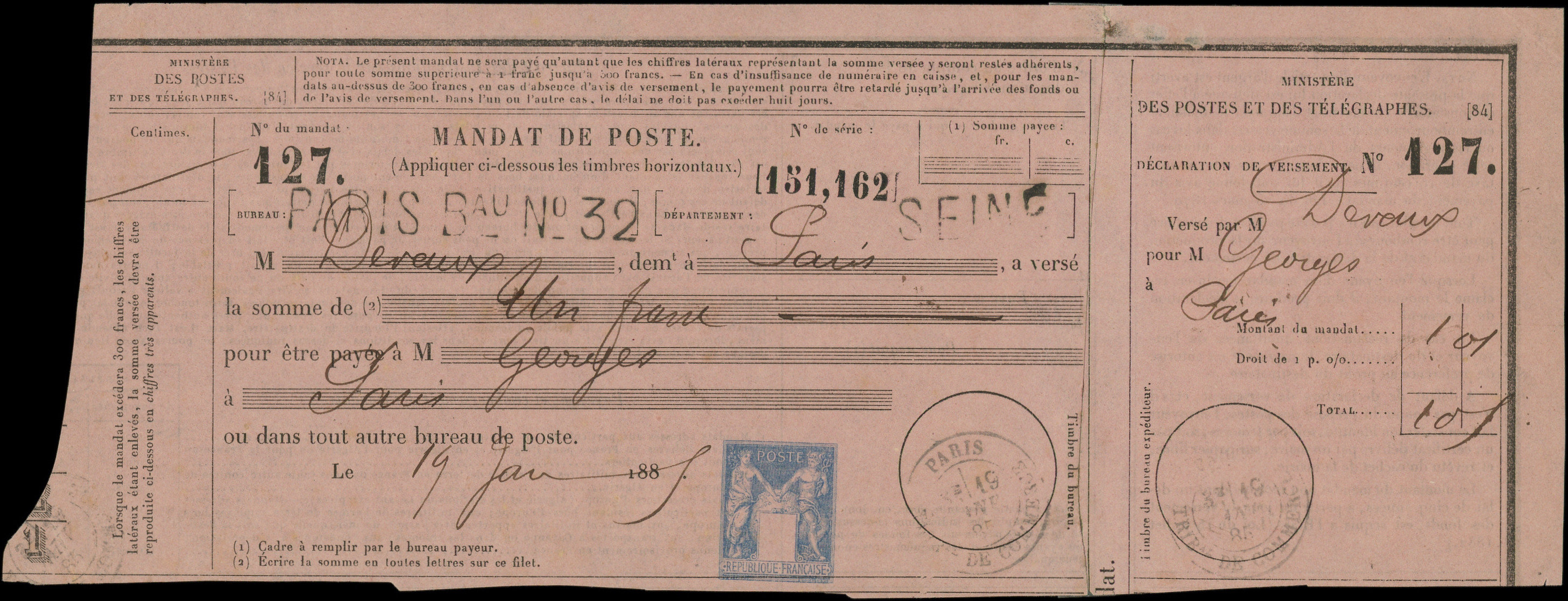 cartouche vide, Mandat n°P3, papier rose, chiffre 84, obl. PARIS 19/1/84, TB (Image)