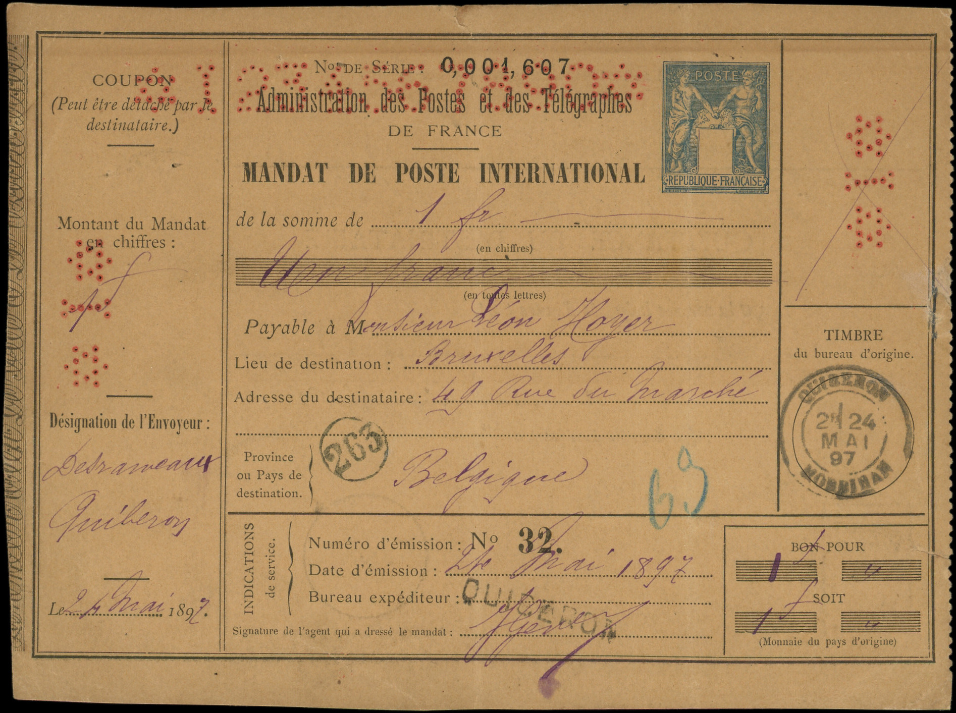 cartouche vide, Mandat International n°P8b avec perforations 1234567890 et valeur (ici 1f. perforé *1*), càd QUIBERON 24/5/97, RR, TB (Image) (Image2)