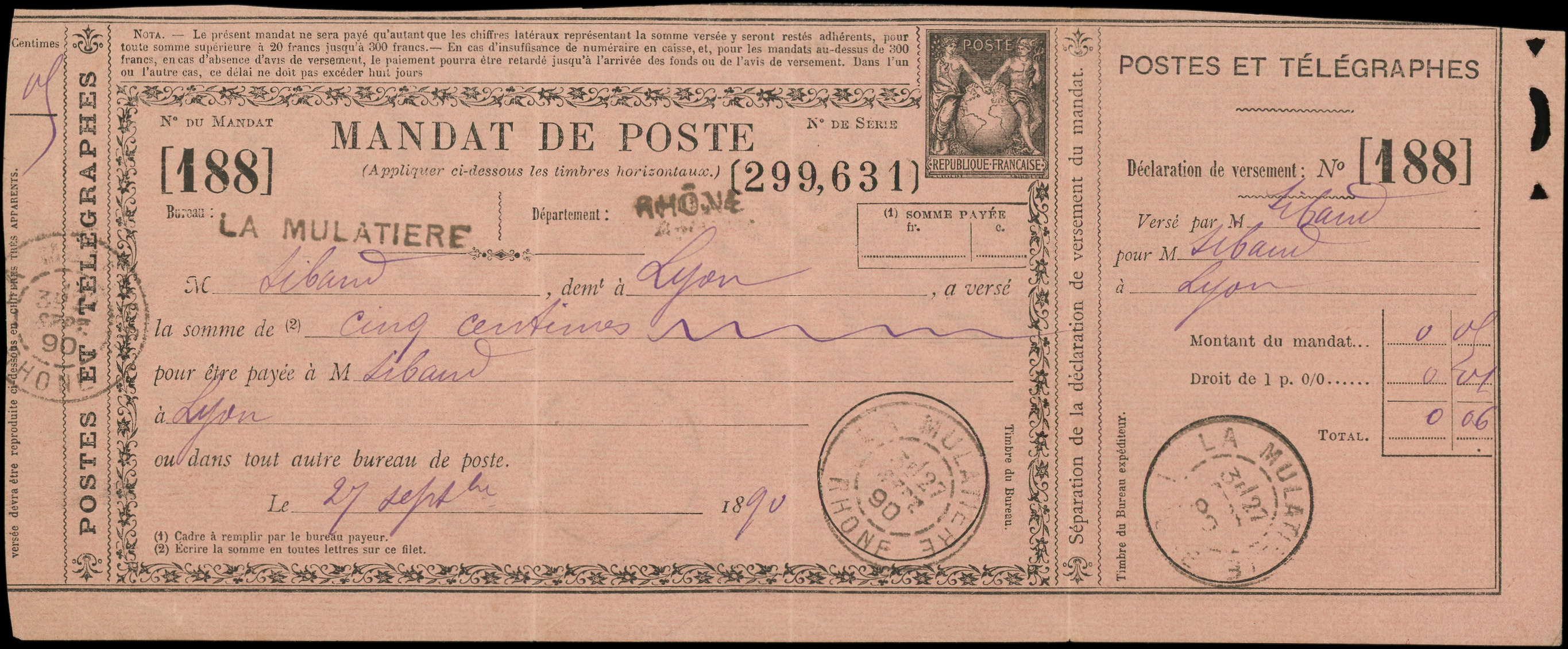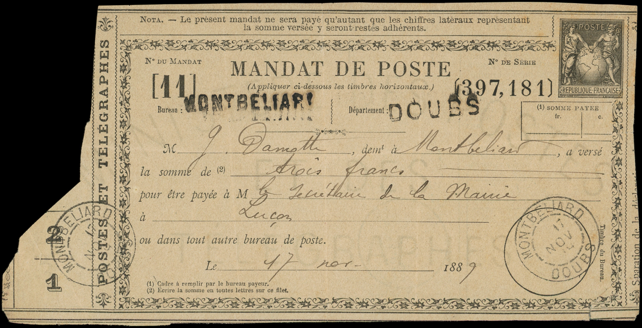 avec Globe, Mandat n°R5 POSTES ET TELEGRAPHES, papier rose Mill.188, càd MONTBELIARD 17/11/89, plis habituels, TB (Image)