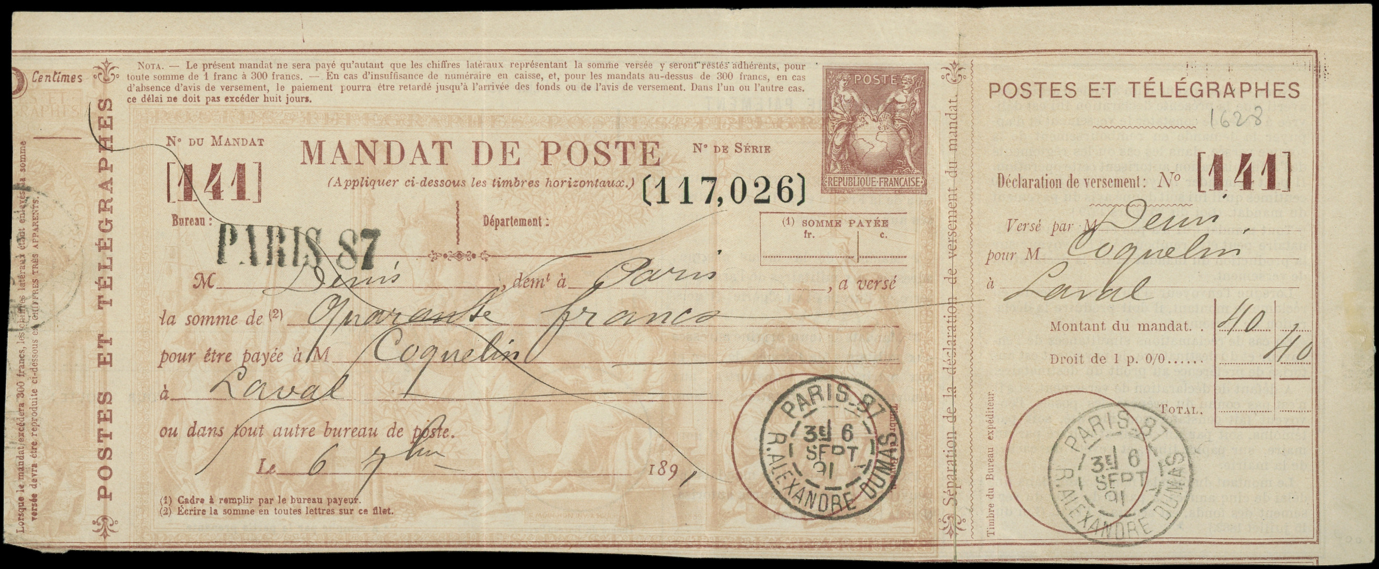 avec Globe, Mandat n°R9 Mill. 189 papier blanc, càd PARIS 87 6/9/91 avec talon, TB (Image)